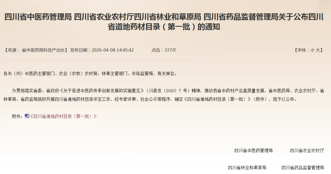 为贯彻落实省委、省政府《关于促进中医药传承创新发展的实施意见》(川委发〔2020〕7 号)精神,推动我省中药材产业高质量发展,省中医药局、农业农村厅、省林草局、省药监局组织开展四川省道地药材目录评定工作,经专家评审、社会公示等程序,确定《四川省道地药材目录(第一批)》(附件),现予以公布。