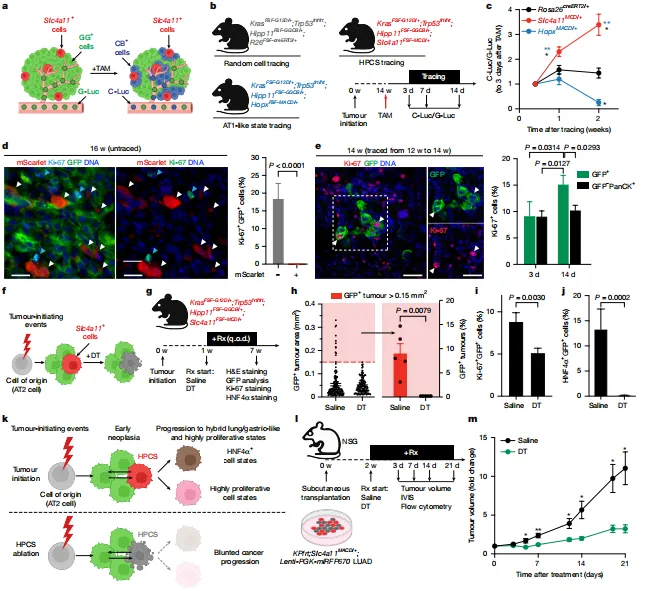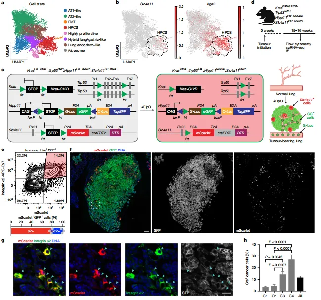 单细胞测序确定Slc4a11与 Itga2为高可塑性细胞标志物,在 KP 肺腺癌中占比约 13.1%。经 Slc4a11‑MCD 系统验证,mScarlet⁺ HPCS 占 GFP⁺ 癌细胞 17.0%,呈小簇/散在分布,且密度随病理分级上升,证实该系统可特异性标记 HPCS,其比例随肿瘤恶化递增(图1)。