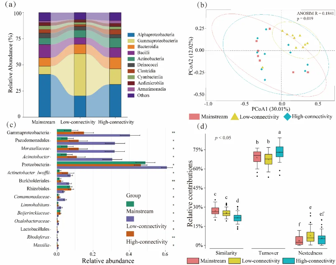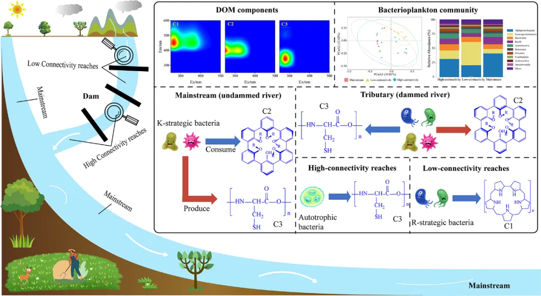 溶解性有机质(DOM)是河流生态系统中物质循环与能量流动的重要组成部分,其组成特征与微生物群落之间存在密切的相互作用关系。一方面,由于微生物对底物的利用偏好及其代谢能力的差异,DOM的组成在很大程度上受到微生物群落结构的调控;另一方面,由环境异质性和来源多样性所导致的DOM分子组成差异也会显著影响微生物群落结构,从而共同调控河流碳循环过程与生态系统功能。河流连续体理论(RCC)强调沿程环境梯度对生物群落与能量流动的控制。然而,河流筑坝通过延长水力停留时间并限制生物及有机物向下游转移,改变了河流连通性强度,进而从根本上削弱了河流连续体的预测能力,并对生态系统结构与功能产生深远影响。已有研究表明,河流连通性降低可引起DOM性质变化并重塑浮游细菌群落,但二者在不同连通性条件下的相互关系及其调控机制仍有待进一步探讨。为此,本研究对不同连通性强度的河流进行现场采样调查,揭示了河流连通性对DOM与浮游细菌群落之间相互作用的调控机制。