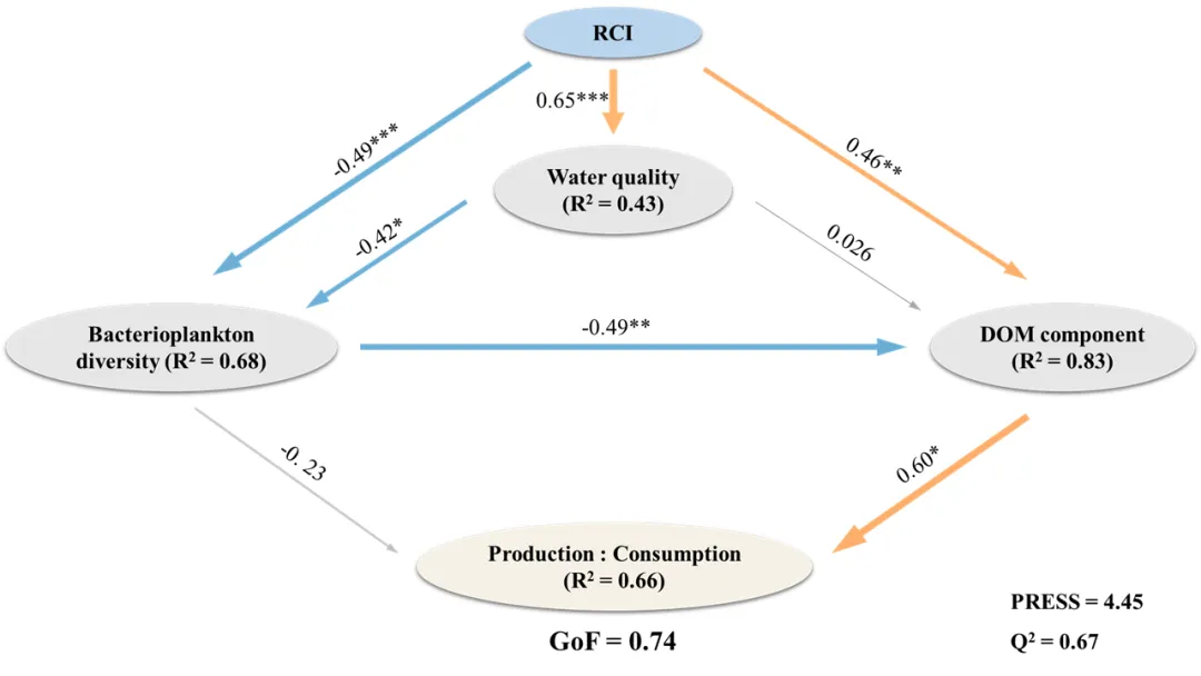 本研究通过野外采样发现,无论连通性强度如何,闸坝均显著改变了DOM的组成特征,而浮游细菌群落结构则主要受河流连通性梯度影响(图2)。在低连通性河段,γ-变形菌成为优势菌种,并作为关键类群在维持群落网络稳定性中发挥重要作用(图2)。偏最小二乘路径模型分析(PLS‒PM)显示,总氮(TN)和电导率(EC)是影响浮游细菌多样性的关键环境因子(图3)。随着河流连通性指数(RCI)降低,浮游细菌多样性增加,并对DOM组分产生负面影响,进而改变其利用途径。同时,低RCI条件下水力停留时间延长,促进了DOM的自然转化过程,增强了微生物对DOM的利用效率。研究结果表明,河流连通性在调控微生物与碳循环相互作用中具有关键作用,为深入理解河流连通性降低引发的生态过程变化提供了新的认识。▲图1 摘要图(来源:ScienceDirect) ▲图2 细菌群落结构,(a)物种组成。(b)细菌群落基于Bray-Curtis距离的主坐标分析,红色、黄色和蓝色分别表示干流、低连通性河段和高连通性河段。(c)基于线性判别分析展示不同连通性强度下的物种差异。(d)不同连通性强度下的相似性、周转和嵌套差异性检验。▲图3 PLS‒PM模型揭示河流连通性指数(RCI)、水质(如EC和TN)、浮游细菌多样性(Ace指数与PCoA1轴)及DOM组分(C2和C3)对DOM和浮游细菌相互作用(产生:消耗,即DOM与浮游细菌间正、负相关边比例)的调控路径;黄色、蓝色和灰色箭头分别表示显著正相关、负相关和不显著相关。(来源:ScienceDirect)[1] Ji, J., Cao, X., Wang, R., Tao, J., Wu, M., Sun, Y., Chu, J., Kou, X., Cao, X., Wang, J. and Peng, J. 2026. New insights into the interaction between bacterioplankton community and dissolved organic matter driven by river connectivity. J. Environ. Manage. 399, 128690. https://doi.org/10.1016/j.jenvman.2026.128690.联系作者:汪杰,副教授,中国农业大学资源与环境学院,Email:jiewangcau@cau.edu.cn曹晓峰,副研究员,清华大学环境学院,水质与水生态研究中心,Email:xfcao@tsinghua.edu.cn| 版权申明:本公众号为非盈利性新媒体,所刊载文章版权属于原作者及相关出版商所有,如发生侵权行为,请及时与公众号编辑联系,我们会与原作者、相关出版机构协商解决。 |