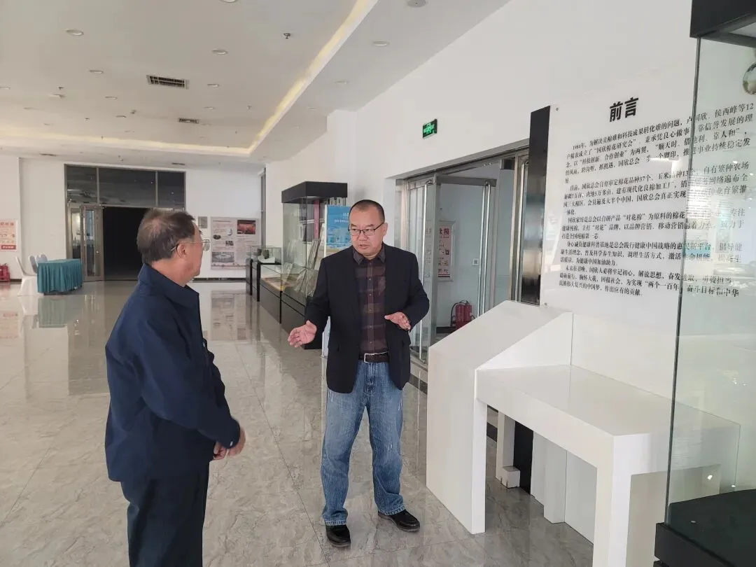 在卢怀玉会长陪同下,李建生教授一行首先走进国欣科技园区,实地察看科研育种基地,详细了解国欣在作物育种、品种选育等方面的进展与成果。随后在国欣综合展厅,卢怀玉全面介绍了企业42年发展历程、国欣种业研究院组织架构及产学研融合发展情况。