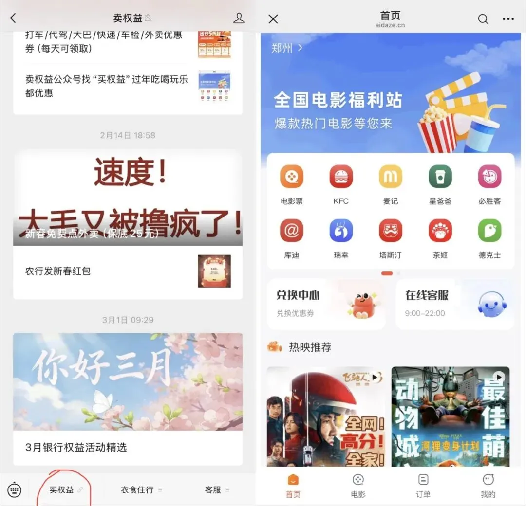 公众号“卖权益”主板块升级“优惠电影票”/“优惠点餐”/“优惠视听会员”等多个功能,日常有需求的客户可以多来看看比价