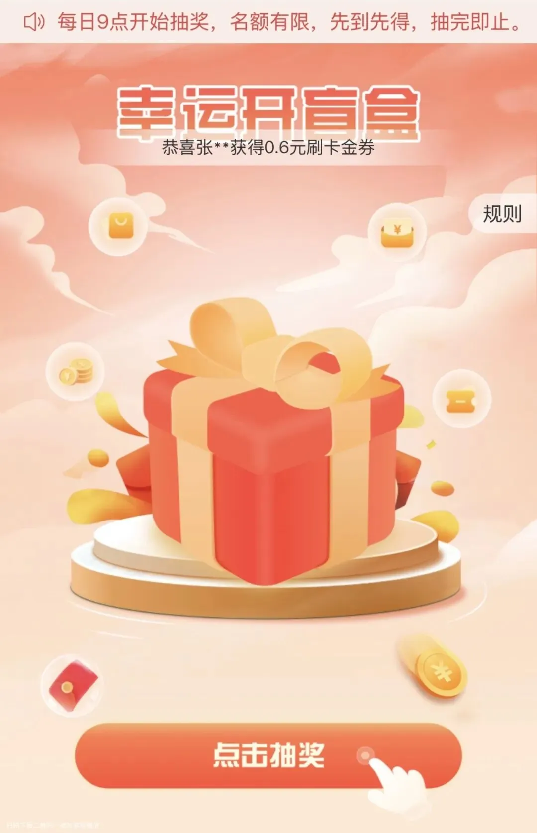每周一9点,抽:0.6/66/666元刷卡金、2倍积分,月限1次,每周3万名额