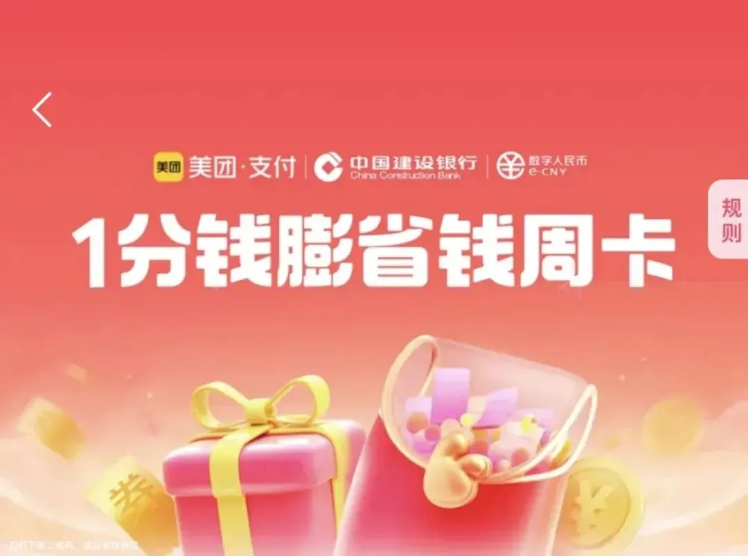 每周,1分钱购:10张1元美团支付券,周限1次*提示不受邀的,美团APP-搜“数字人民币”-软钱包-添加建行钱包
