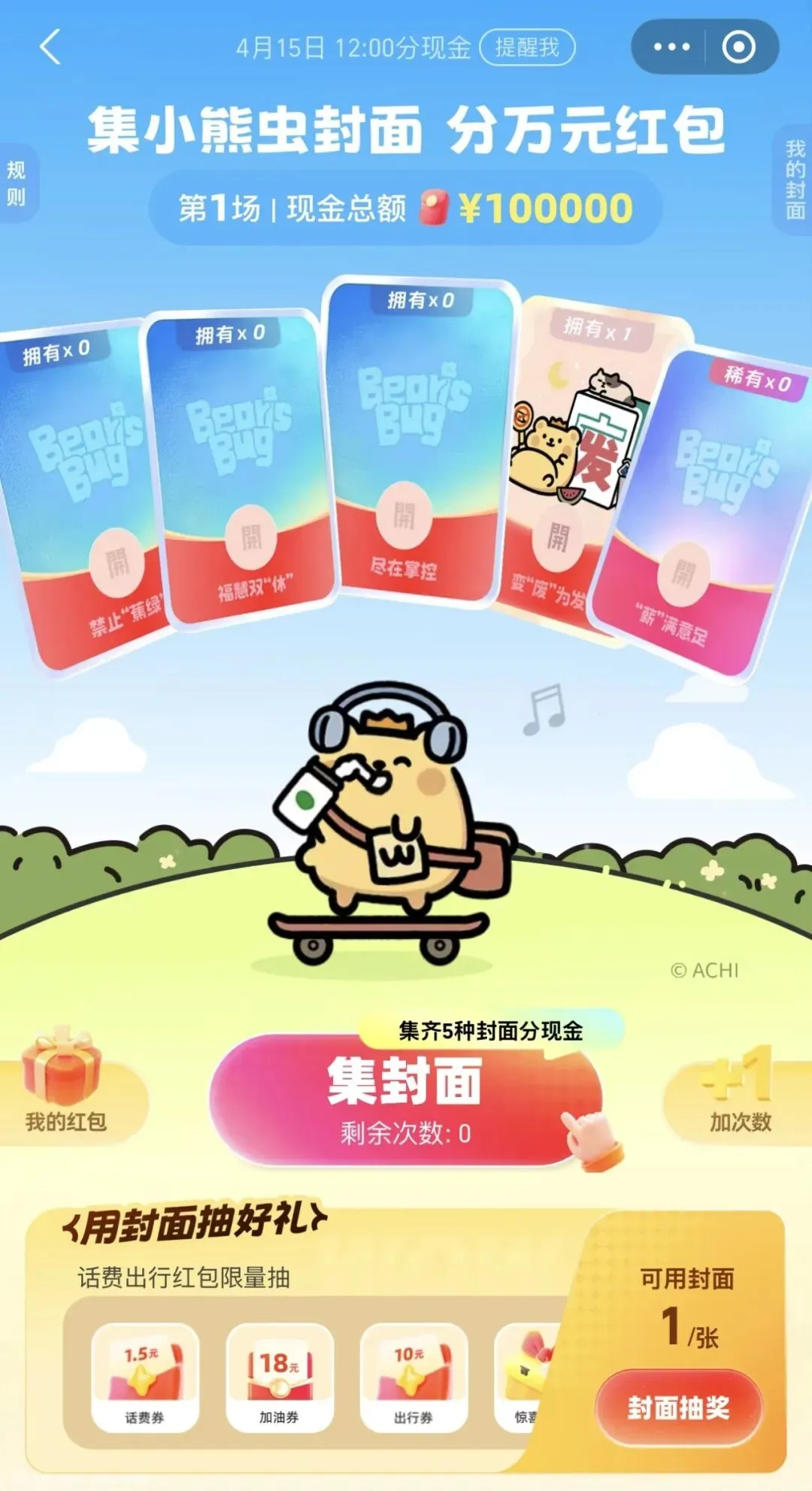 支付宝做简单任务集齐封面瓜分10万现金红包,4.15日12点瓜分。