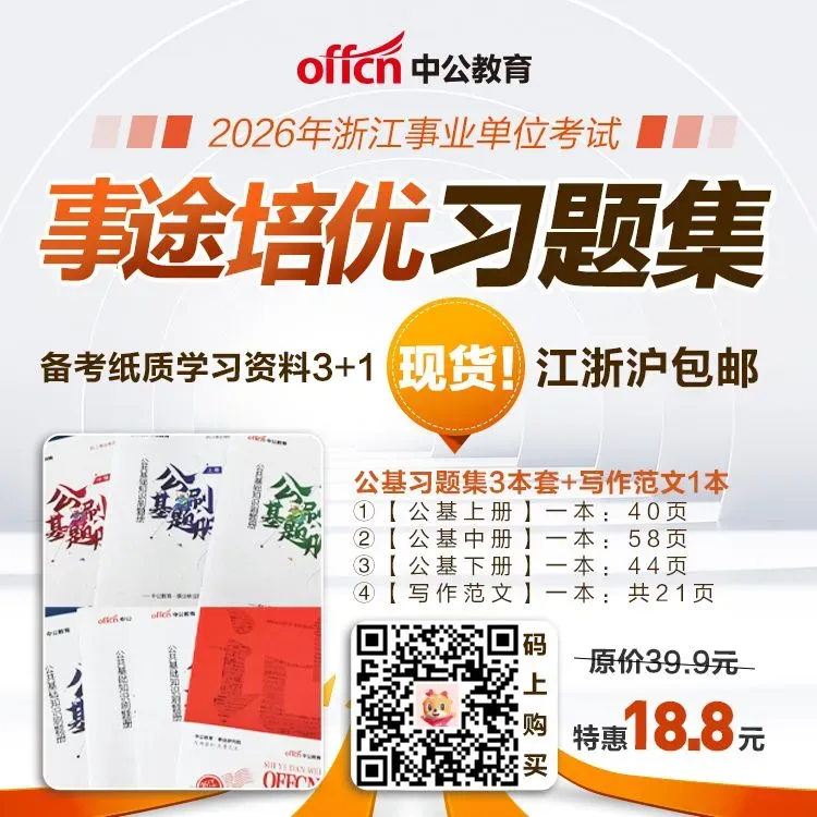 ▼▼▼ 纸质包邮!陆续发货中! 宁波事业单位培优学习包 公基习题集4本套+写作范文1本 特惠价只需18.8元,点击图片购买: ▼▼▼ 浙江事业单位夜猫刷题班 公基、写作、职测 三大模块自由组合 点击图片报名: