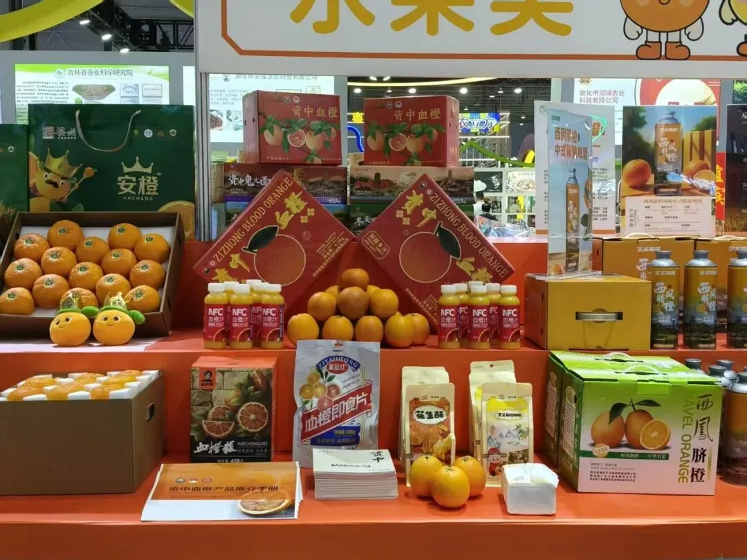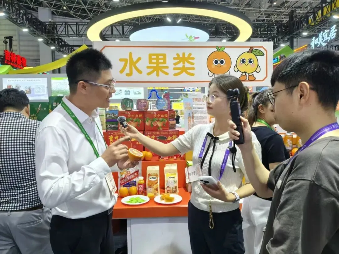 展会现场,集团以“原产地、高品质、深加工”为核心亮点,集中展出资中血橙鲜果、NFC血橙汁、血橙酒、血橙即食片、血橙糕等多元化产品,构建起“鲜果+饮品+休闲食品”的完整产品矩阵,全方位、多维度展现资中血橙全产业链开发建设成果。