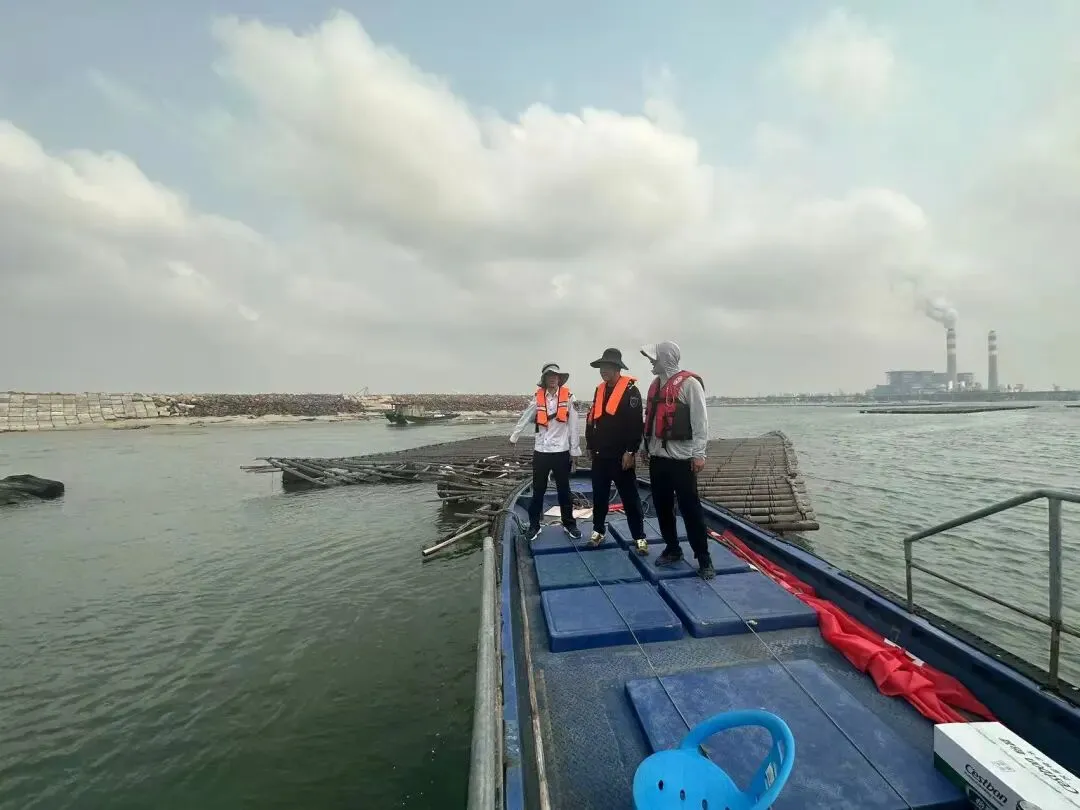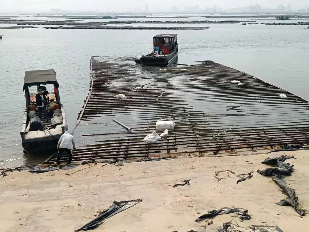 2026年4月13日,为持续规范海域使用行为,巩固禁养区清理整治成果,港口区海洋局联合市海洋与渔业执法支队对海森特码头附近海域禁养区开展清理无人认领废弃蚝排蚝柱行动,共清理6张无人认领废弃蚝排。