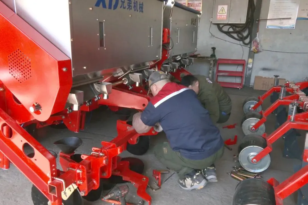 在兄弟农业机械制造有限公司生产车间,工人正对马铃薯秸秆还田机进行全方位细致检查,确保各项性能指标合格。