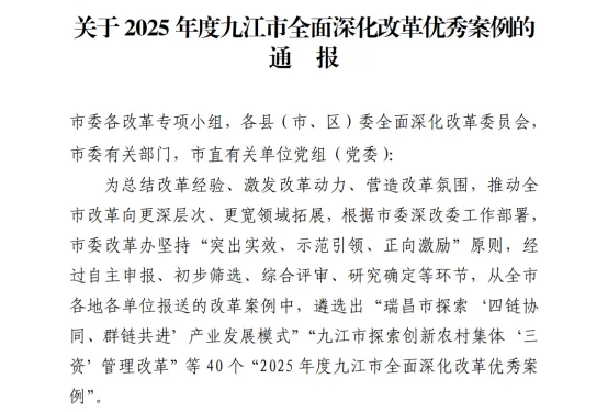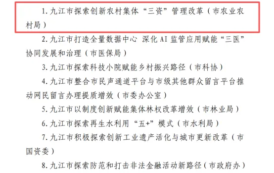 近日,中共九江市委全面深化改革委员会办公室公布2025年度九江市全面深化改革优秀案例,市农业农村局报送的《九江市探索创新农村集体“三资”管理改革》入选。