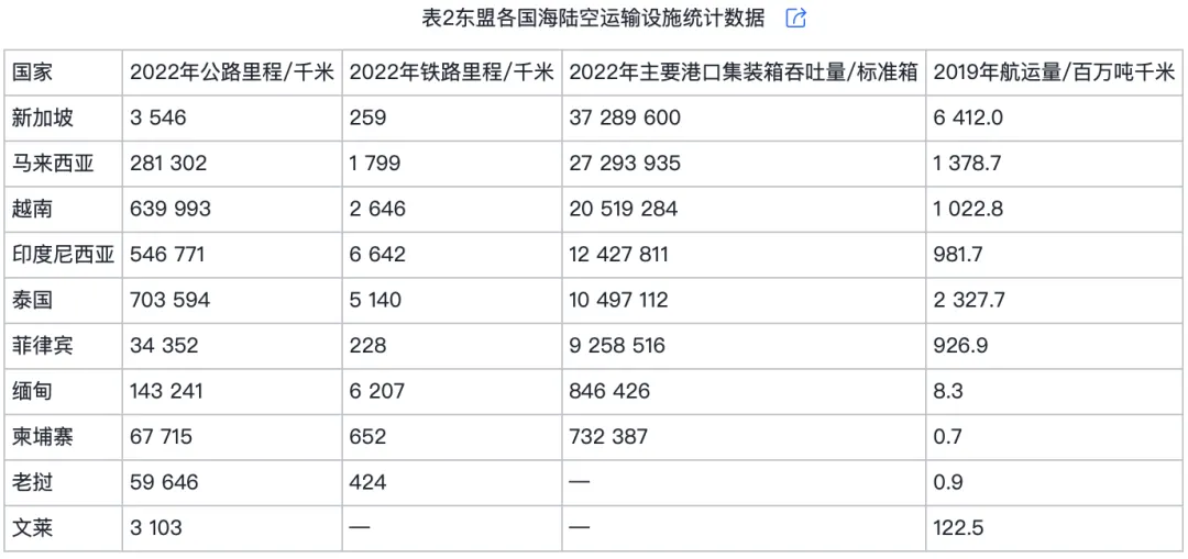 然而,东盟成员国间物流运输条件差异较大(表2)。处于第一梯队的新加坡、马来西亚和文莱,交通基础设施完善,为区域贸易提供了重要支撑。新加坡是全球顶级枢纽港,2022年新加坡主要港口集装箱吞吐量约达3 729万标箱,其机场服务也位居全球前列。马来西亚凭借马六甲海峡的出入口位置,海上运输占据优势。文莱虽无铁路,但国内交通状况良好,现代化高速公路贯穿主要居民点。而泰国、印度尼西亚和越南,其物流能力呈现结构性失衡特征。越南铁路运输比例低,但海洋运输发展迅速。印度尼西亚作为群岛国家,主要依靠公路和海运。泰国公路运输发达,但铁路系统相对落后。柬埔寨、缅甸和老挝的物流条件处于东盟末端。