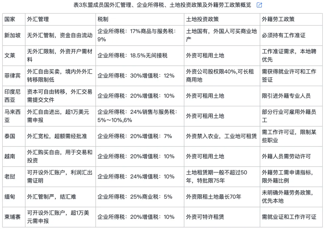自2020年11月15日RCEP签署以来,中国与东盟通过多层级制度安排持续推进农业合作深化。2023年《中国-东盟关于深化农业合作的联合声明》的发布,叠加既有双边农业投资贸易协议网络,区域农业合作进入机制化建设新阶段。然而,成员国间的政策差异构成实质性合作壁垒(表3)。在外汇管理层面,尽管多数东盟国家实行自由汇兑政策,但泰国、马来西亚和柬埔寨对超额交易实行审批制,老挝利润汇出需提交证明,缅甸存在结汇困难。在土地和劳工政策方面,东盟国家对外资拥有土地有限制,多数国家仅允许租赁。印度尼西亚、越南和老挝土地政策灵活,对外商投资农业较为友好,而泰国禁止外资进入农业投资领域。此外,区域内税制差异显著,新加坡、文莱凭借“税收洼地”效应吸引资本集聚,而缅甸、菲律宾等国企业所得税率高达25%~30%,形成显著的投资成本梯度。错综复杂的政策差异,共同构成了“外来者劣势”的制度性根源,企业需为适应陌生的制度环境而承担额外的合规成本与运营风险。面对制度性障碍,中国与东盟正通过战略对接寻求突破。RCEP框架下,区域内90%以上货物贸易将实现零关税。