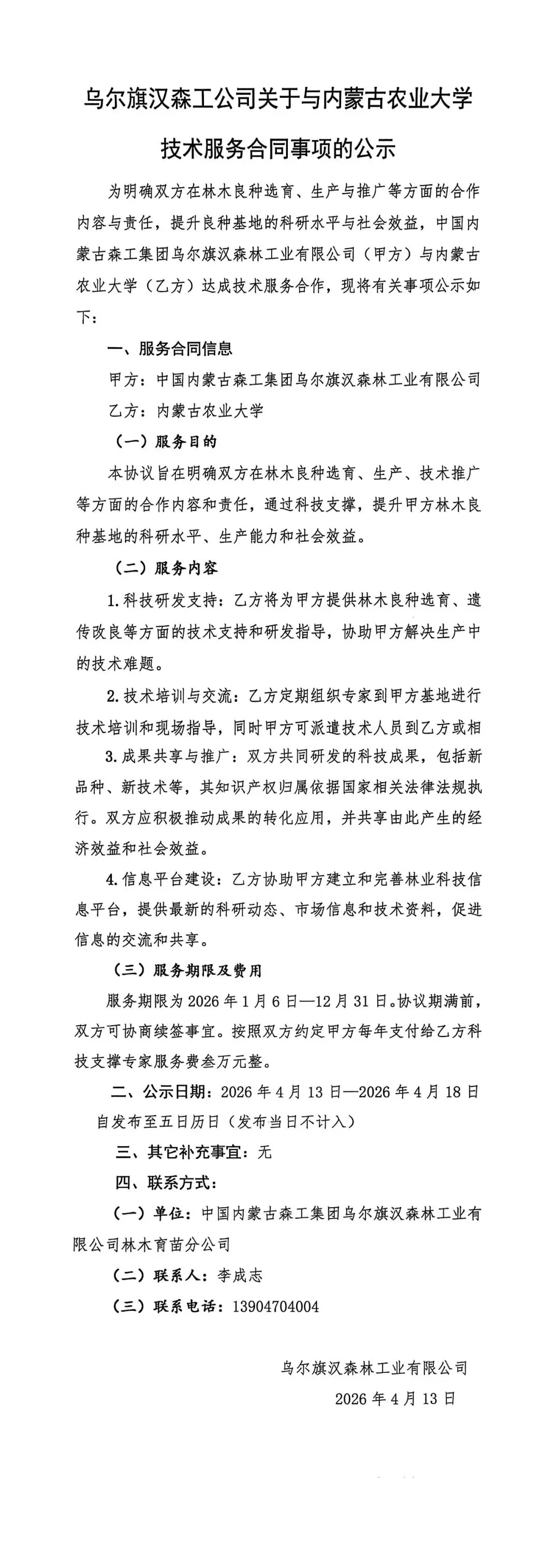 公示 | 乌尔旗汉森工公司关于与内蒙古农业大学技术服务合同事项的公示
