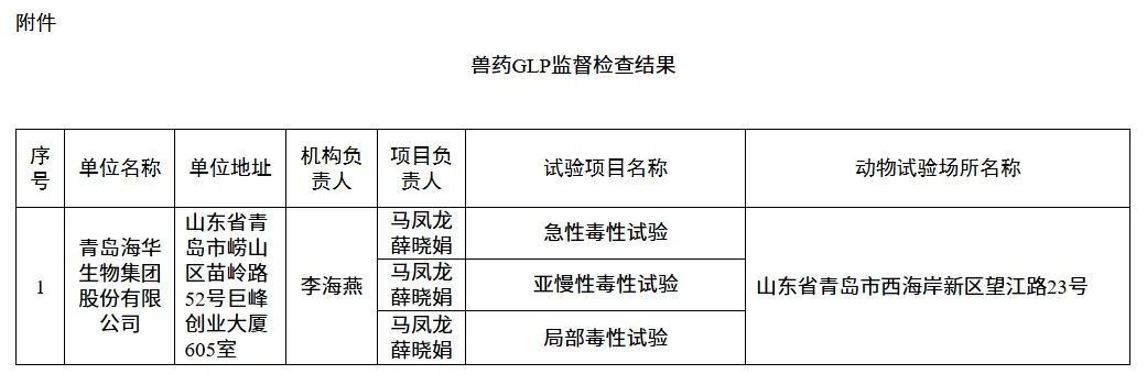 近日,按照《兽药管理条例》、《兽药非临床研究质量管理规范》、《兽药非临床研究与临床试验质量管理规范监督检查办法》、《兽药非临床研究质量管理规范监督检查标准》以及监督检查相关要求,我局组织中国兽医药品监察所对首次申请成为兽药非临床研究机构的青岛海华生物集团股份有限公司符合兽药非临床研究质量管理规范(简称兽药GLP)有关情况进行了监督检查。经检查,青岛海华生物集团股份有限公司申请的3个试验项目符合兽药GLP要求。