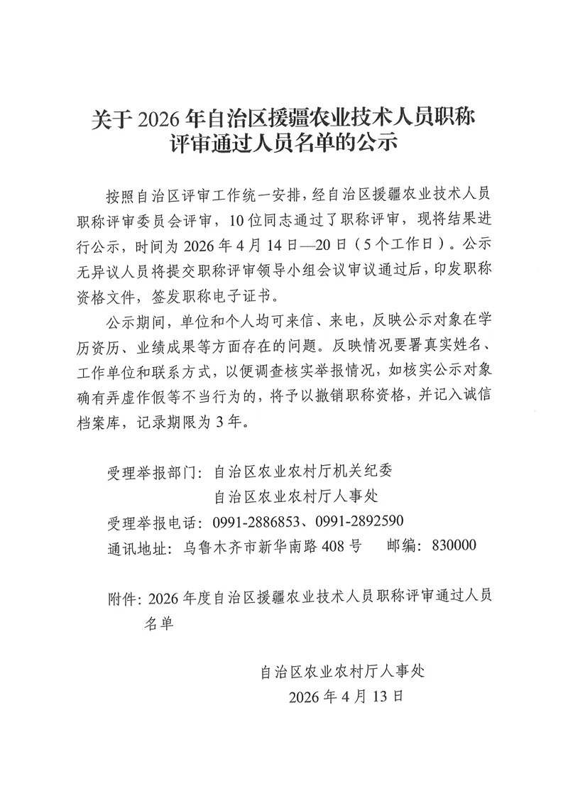 >新疆维吾尔自治区农业农村厅关于2026年自治区援疆农业技术人员职称评审通过人员名单的公示