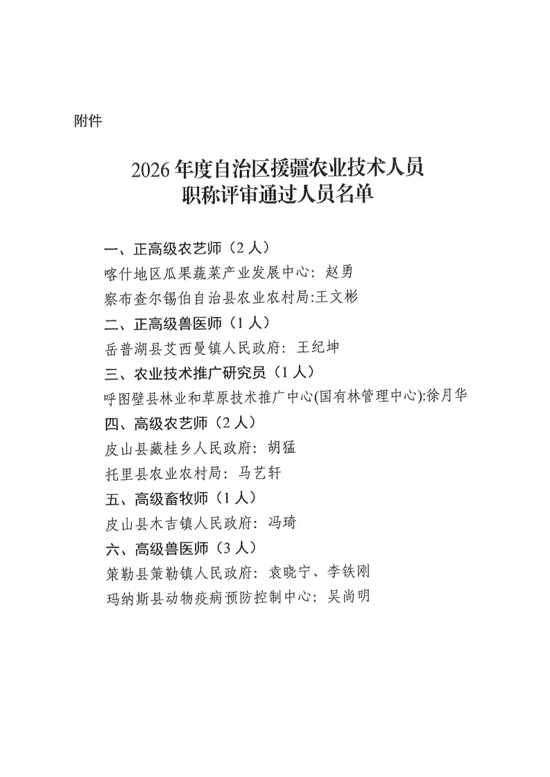 新疆维吾尔自治区农业农村厅关于2026年自治区援疆农业技术人员职称评审通过人员名单的公示