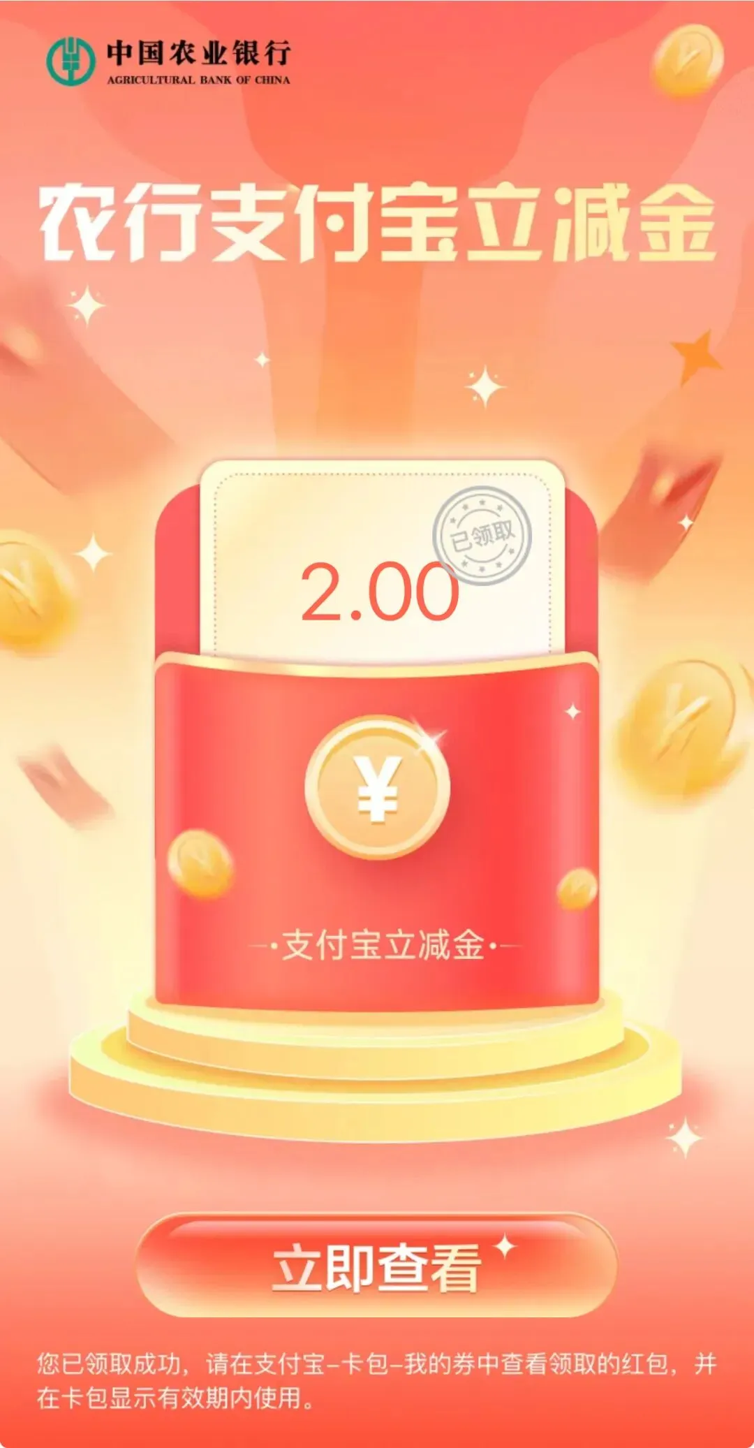立减金到账后,可在后续使用农行APP进行消费支付时自动抵扣,具体使用范围以页面说明为准。