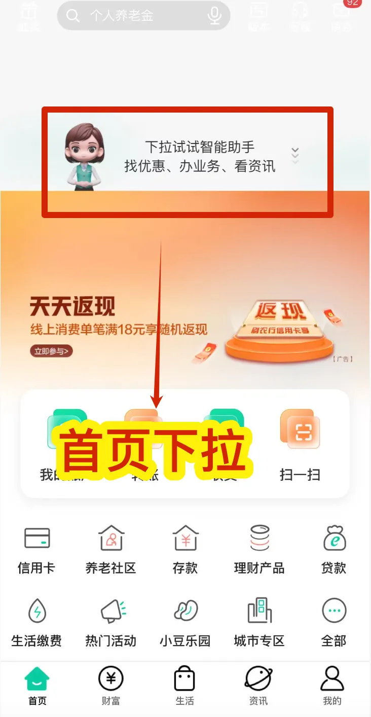 第二步: 进入APP首页后,在顶部区域向下滑动(即下拉操作),页面将自动跳转进入"智能助手"对话界面。