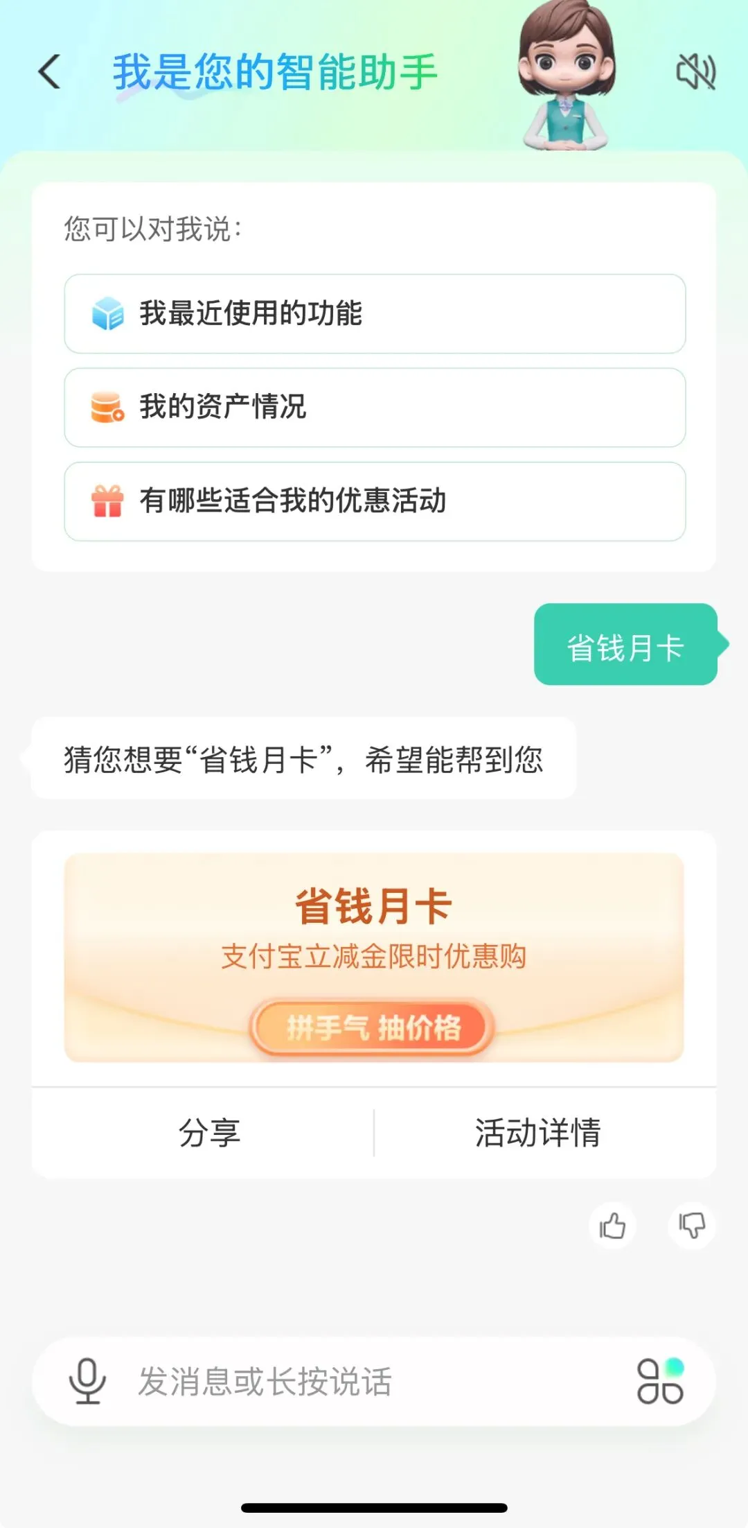 第三步: 在智能助手的输入框中,准确发送关键词"省钱月卡"(四个字,无需添加其他内容),系统将自动识别并弹出对应活动页面。