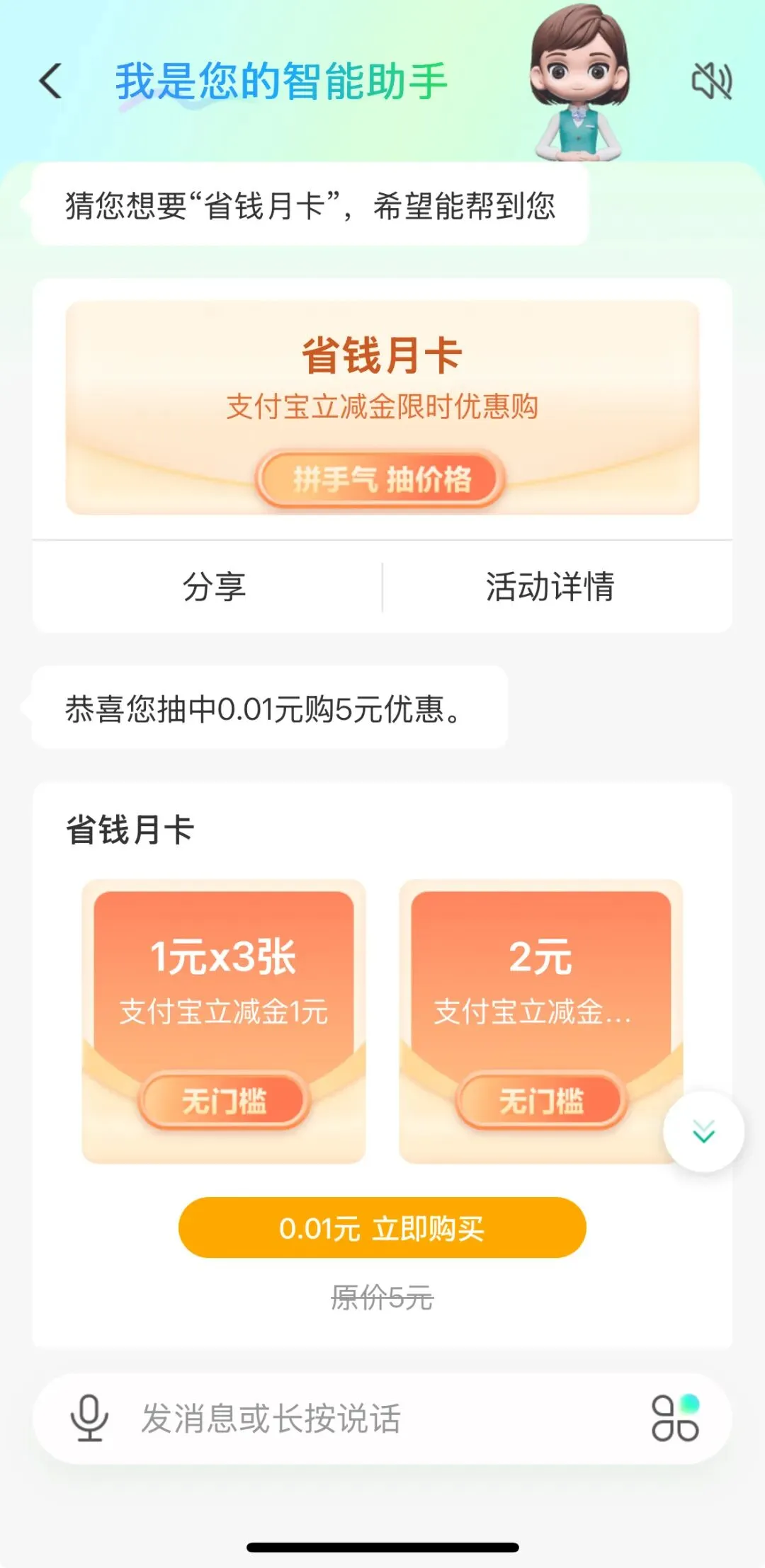 活动内容: 用户通过智能助手入口发送指定关键词,即可参与随机折扣抽取,最低以0.01元的价格获得一张面值5元的立减金券。