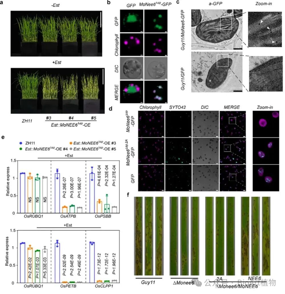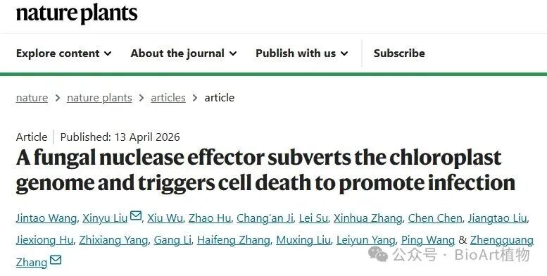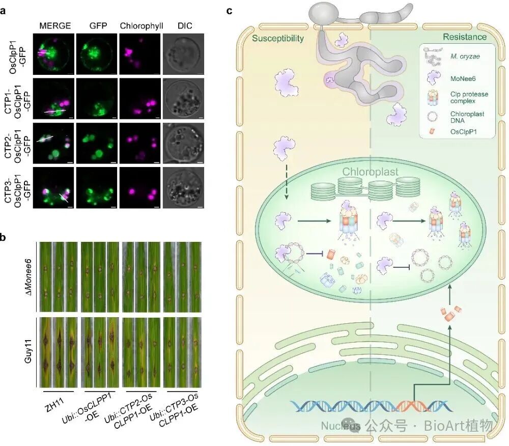 在植物与病原菌长期博弈的过程中,病原菌如何精准操控宿主细胞的命运,是决定其侵染成败的关键。稻瘟病作为威胁全球粮食安全的重要病害之一,其发病机制一直备受关注。近日,南京农业大学张正光团队在国际学术期刊 Nature Plants 上在线发表题为“A fungal nuclease effector subverts the chloroplast genome and triggers cell death to promote infection”的研究论文,揭示了稻瘟病菌诱导水稻细胞死亡、实现由活体营养向死体营养转变的分子机制,发现一种全新的病菌靶向叶绿体的致病策略。稻瘟病菌是典型的半活体营养型病原真菌。侵染早期,病菌需要维持寄主细胞的存活状态,以便在活体组织中定殖和扩展;而到了侵染后期,它又必须促使宿主细胞死亡,从而获取更多营养并完成快速繁殖。因此,能否顺利完成从“活体营养”到“死体营养”的转变,直接决定了病菌的致病能力。围绕这一关键科学问题,研究团队从稻瘟病菌侵染中、后期显著上调表达的候选效应蛋白中开展系统筛选,最终鉴定出一类与死体营养阶段密切相关的效应蛋白,其中 MoNee6 对病菌毒力的贡献最为突出。研究发现,MoNee6 进入寄主细胞后,会精准定位到水稻叶绿体中(图1b,c),并以核酸酶的形式直接降解叶绿体 DNA(图1d),抑制叶绿体基因表达(图1e),最终诱导宿主细胞死亡(图1a)。叶绿体不仅承担光合作用和能量代谢,也是植物免疫调控的重要细胞器。MoNee6 对叶绿体基因组的直接攻击表明,稻瘟病菌在侵染后期并不仅仅是干扰宿主的某一条防御信号通路,而是通过破坏叶绿体这一核心细胞器的遗传基础,推动寄主细胞走向死亡,从而为自身的扩展创造有利条件(图1f)。该研究揭示了病原真菌促进寄主细胞死亡以完成营养转变的一种新机制,也拓展了人们对效应蛋白作用方式的认知。图1 MoNee6靶向水稻叶绿体降解其基因组促进水稻发病研究还发现,植物并非完全被动应对这一过程。叶绿体中的 Clp 蛋白酶复合体能够识别并降解 MoNee6,在一定程度上抑制其毒性发挥。然而,MoNee6 同时还能抑制叶绿体基因组编码的 OsCLPP1 表达,削弱这一蛋白质稳态防御系统的能力。基于此,研究团队进一步提出了一种新的抗病设计思路:将原本由叶绿体基因组编码的 OsCLPP1 改造为“核编码、叶绿体靶向”的形式,使其绕过病原菌对叶绿体基因表达的压制,重新进入叶绿体发挥作用。实验结果表明,该策略能够显著促进 MoNee6 的降解,增强水稻对稻瘟病的抗性(图2a和2b),且不会对主要农艺性状造成明显影响。研究团队通过揭示稻瘟病菌“破坏叶绿体基因组”以诱导宿主细胞死亡的新机制,提出“重建叶绿体防御体系”的策略(图2c),为水稻抗病育种和病害绿色防控提供了新思路。同时,由于 MoNee6 及其同源蛋白广泛存在于多种半活体营养型和死体营养型真菌中,该研究也有望为其他作物的病害防控带来启发。图2 改造OsClpP1蛋白酶,重建叶绿体防御体系以提升稻瘟病抗性南京农业大学植物保护学院博士生王金涛为论文第一作者,张正光教授和刘昕宇副教授为并列通讯作者。张海峰教授、刘木星教授、李刚教授、杨雷云教授以及路易斯安那健康科学中心的Ping Wang教授参与了该研究。该研究得到了国家重点研发计划,中国科协青年人才托举工程和国家自然科学基金项目的资助。论文链接:https://www.nature.com/articles/s41477-026-02276-x