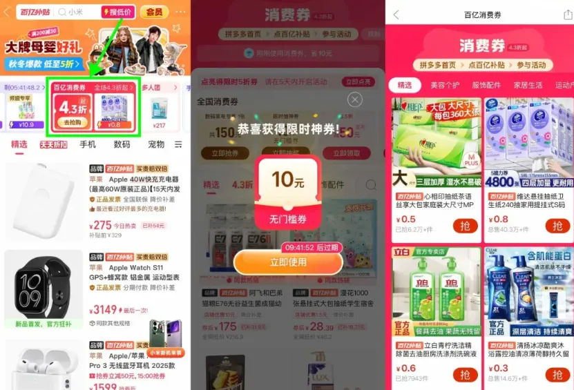 拼多多APP首页“百亿补贴”->百亿消费券->抽16亓无门槛券,有很多几毛包邮的大牌实物