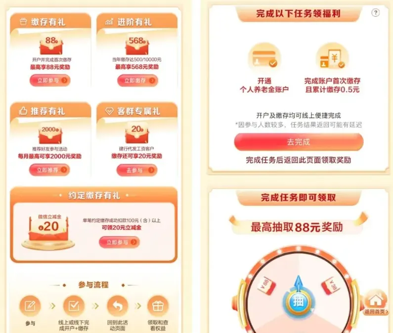 1、建行养老金缴存有礼,领38/58/88元微信立减金首次缴存养老金账户100%必中!!!