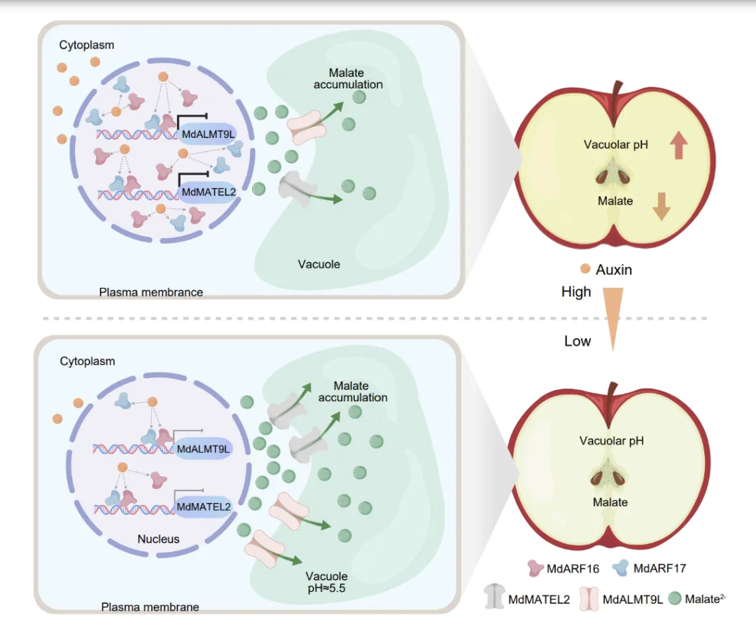 近日,山东农业大学园艺科学与工程学院苹果果实品质生物学与营养健康团队联合美国康奈尔大学和山东省果树研究所在The Plant Cell期刊上发表了题为“MdARF16/17 Link Auxin Signaling to Ma1-Independent Control of Vacuolar Malate Transport in Apple.”(https://doi.org/10.1093/plcell/koae106)的研究论文,揭示了生长素信号调控苹果果实酸度的分子机制。