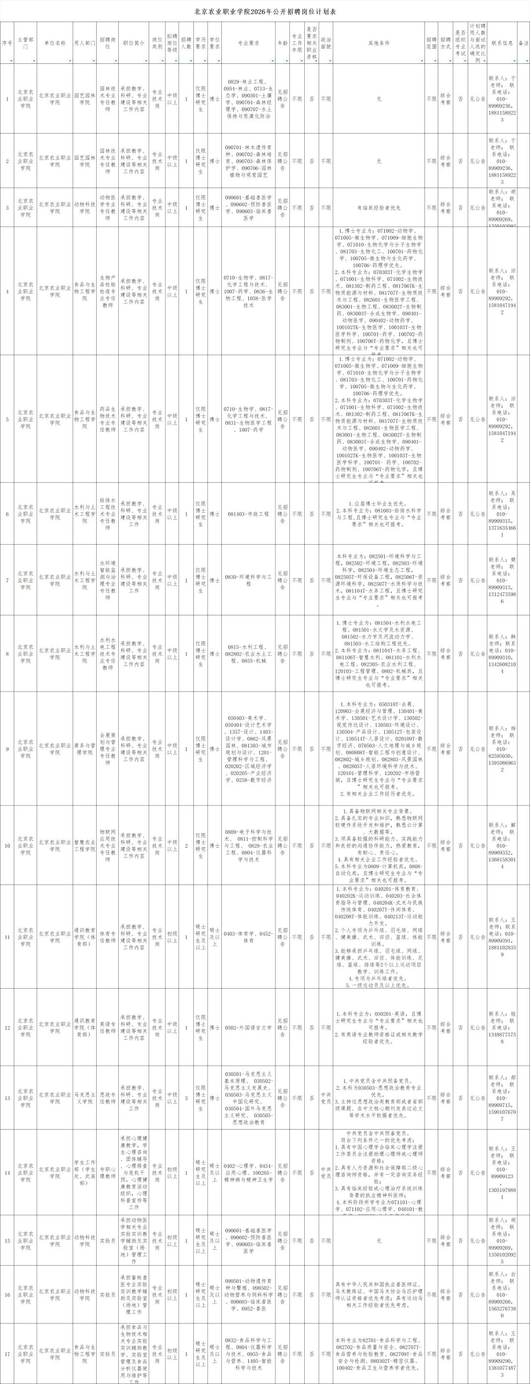 根据《北京市事业单位公开招聘工作人员实施办法》(京人社专技发〔2010〕102号)、《关于进一步规范事业单位公开招聘工作有关问题的通知》(京人社专技发〔2012〕247号)和《北京市事业单位公开招聘面试工作暂行办法》(京人社事业字〔2023〕179号)文件精神,结合学校发展需要,现面向社会公开招聘编制内工作人员,公告如下:本次公开招聘事业编制人员20人,其中专任教师岗17人、实验员3人,具体岗位信息和要求详见《北京农业职业学院2026年公开招聘岗位计划表》(附件1)。岗位需求表所列专业代码参考《授予博士硕士学位和培养研究生的学科、专业目录(2008年版)》《研究生教育学科专业目录(2022年)》《普通高等学校本科专业目录(2025年)》、教育部历年公布的专业目录以及经教育部批准的各学校特设专业目录等相关文件。若应聘人员所学专业学科与所报考岗位专业学科名称相同、代码不一致,或专业学科相近但不在选定参考目录的,学校结合所学课程(需提供成绩单)、研究方向等实际情况进行审核。1.国内应届毕业生:列入国家统一招生计划,培养方式为非定向,按时毕业并获得相应学历学位,毕业证书落款年度2年内(2025年、2026年,不含跨年结业转毕业)的高校毕业生,以及2024年离校未就业(未与任何单位签订合同且无单位缴纳社会保险记录)的高校毕业生;非京生源应符合北京市引进毕业生相关政策,须报北京市人力资源和社会保障局批准;须在2026年12月31日前取得学历学位证书并完成毕业手续。2.留学回国人员:须符合北京市人才引进相关条件和在京就业落户有关要求,取得相应学历学位,原则上应于2026年12月31日前取得教育部留服中心学历学位认证书。应达到设站单位出站要求,须在2026年12月31日前取得博士后证书并办结出站手续;非京籍博士后应聘人员还应符合全国博士后管理委员会关于进京落户的条件和要求。社会人员须具有北京市常住户口,已取得岗位要求的学历学位,人事、行政关系在京;须在2026年9月30日前完成入职手续。具有中华人民共和国国籍,政治立场坚定,拥护社会主义办学方向,具有良好的政治素质和道德修养,热爱职业教育事业,认同学院办学理念;遵纪守法、爱岗敬业,具有良好的语言文字表达能力、沟通协调能力和团队合作精神;身体、心理条件符合教育工作岗位要求。1.符合招聘岗位所需要的专业知识和专业技能要求;具备招聘岗位所规定的相应任职资格和条件。具体报名资格条件详见“附件1”。2.年龄38周岁及以下(1987年4月及以后出生)。4.硕士研究生须具有北京市常住户口(上学期间的学校集体户口不属于北京市常住户口)。1.符合招聘岗位所需要的专业知识和专业技能要求;具备招聘岗位所规定的相应任职资格和条件。具体报名资格条件详见“附件1”。2.熟悉相关专业实验操作流程,具备实验器材调试、维护及实验室安全管理的基本能力,能独立完成常规实验准备、实验数据记录与整理工作。3.年龄38周岁及以下(1987年4月及以后出生)。4.硕士研究生须具有北京市常住户口(上学期间的学校集体户口不属于北京市常住户口)。5.曾在公务员招录、事业单位公开招聘中被认定有舞弊行为的;8.有违反教师职业道德规范、教育行业行为准则等行为的;9.不符合《事业单位人事管理回避规定》有关规定的;10.法律法规、政策规定不得聘用为事业单位工作人员的其他情形。本次招聘信息同时在北京市人力资源和社会保障局官网(https://rsj.beijing.gov.cn/xxgk/gkzp)“政务公开-事业单位公开招聘”栏目和北京农业职业学院官网(https://www.bvca.edu.cn)“通知公告”栏目发布,其他平台发布与本次招聘相关信息均不保证其真实性。自公告之日起接受报名,报名截止时间:2026年4月24日24:00。登录北京农业职业学院公开招聘系统(https://rszp.bvca.edu.cn)注册并创建简历,只接收此系统创建并提交的简历,其他途径投递简历无效,简历内容必须完整且与本人实际情况一致,简历填写完毕并提交成功,视为应聘相应岗位。应聘者每人限报一个岗位,创建简历的同时应在招聘系统中上传身份证、户口簿、学历、学位证书(2026届应届毕业生可上传学信网下载的在线学籍报告)、专业技术职务(职称)证书(限社会人员)、手签字版应聘诚信承诺书和应聘岗位要求的其他资历、学术水平以及业绩成果等材料,提交说明见“附件2”。应聘诚信承诺书在招聘系统首页公告栏下载。用人单位依据北京市相关政策及招聘公告要求,对应聘人员进行资格审核,人事处进行复审。应聘者应如实填报基本信息、学习经历、工作经历、奖励荣誉、业绩成果等,凡因应聘人员信息填报不全而影响资格审核的视为资格审核不通过。资格审核情况以短信或邮件形式通知应聘人员,资格审核状态可在招聘系统中查询,资格审核通过的应聘者进入初试环节。资格审核通过的应聘人员,须按初试通知要求提交个人专业能力陈述视频,视频内容另行通知。视频要求本人正脸清晰出镜,连续录制,无剪辑修饰,时长不超过3分钟,视频大小不超过50M,文件名以“应聘岗位编号-应聘岗位名称-姓名-应届/博士后/留学/社会人员”命名,未按时提交上述材料者视为自动放弃。用人单位依据应聘者提交的陈述视频及相关报名材料开展初试工作。初试成绩采取百分制,合格线为80分。初试时间初步定于2026年5月,具体时间和有关要求将