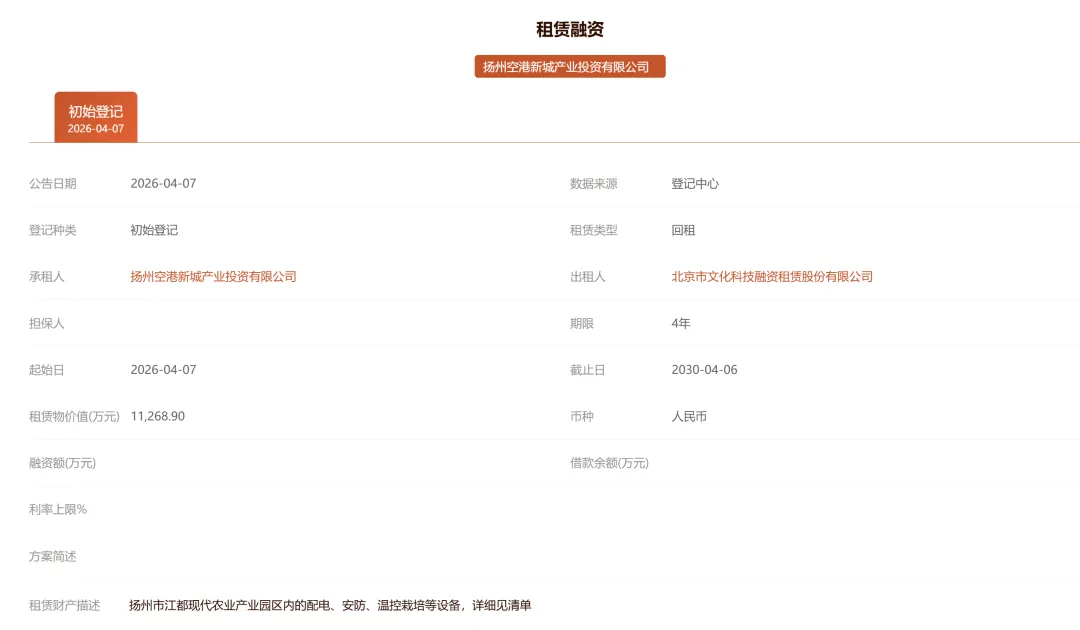 近日,扬州空港新城产业投资有限公司与北京市文化科技融资租赁股份有限公司达成一笔1.1亿元的,为期4年的智慧农业融资租赁事件。