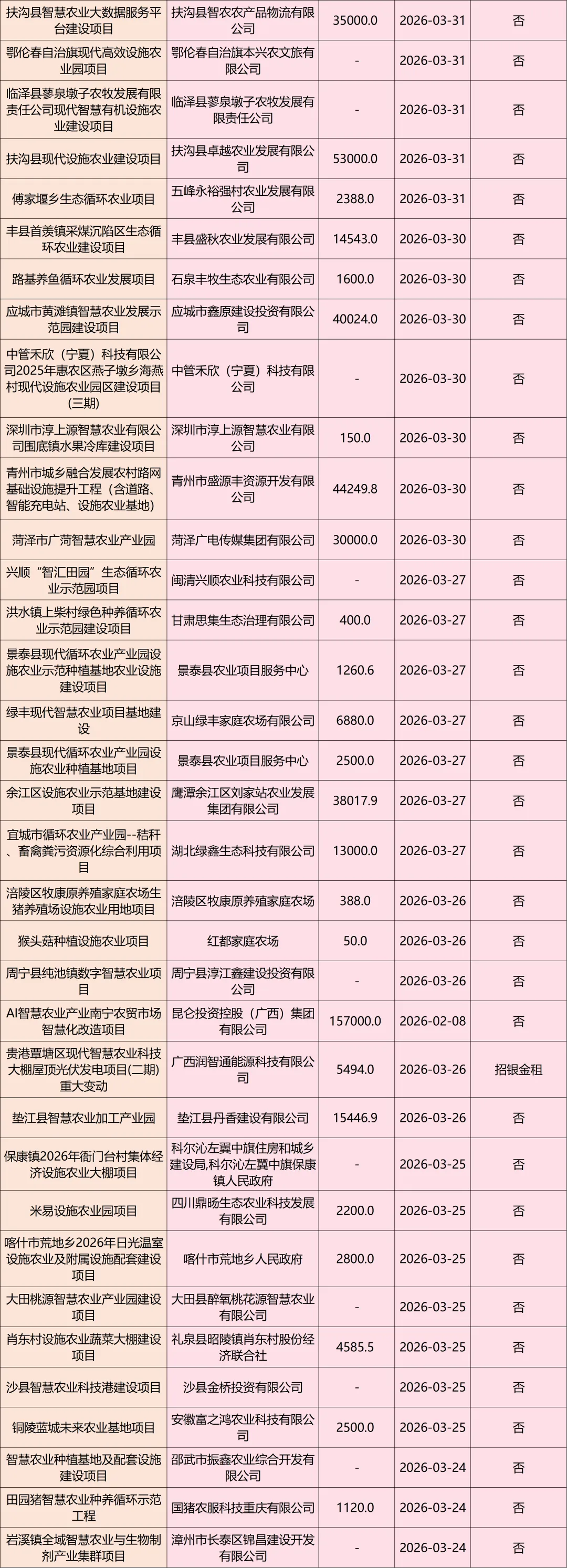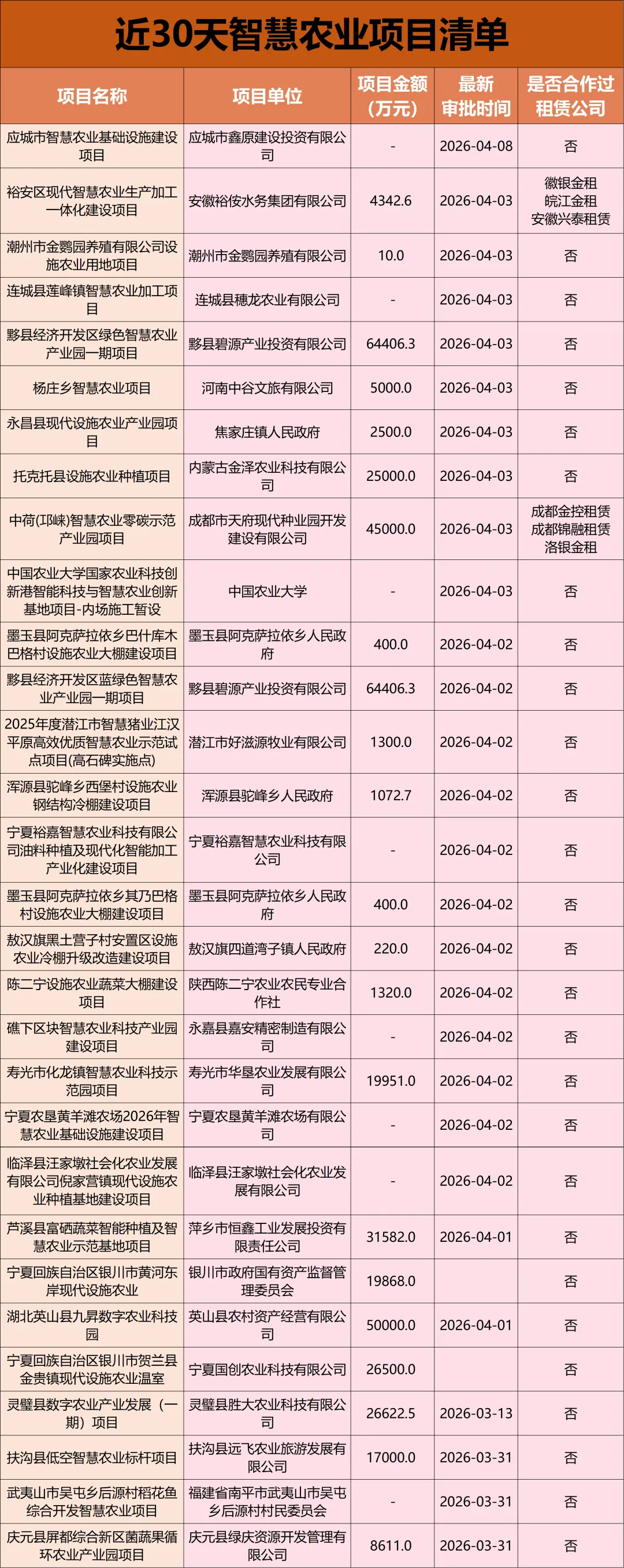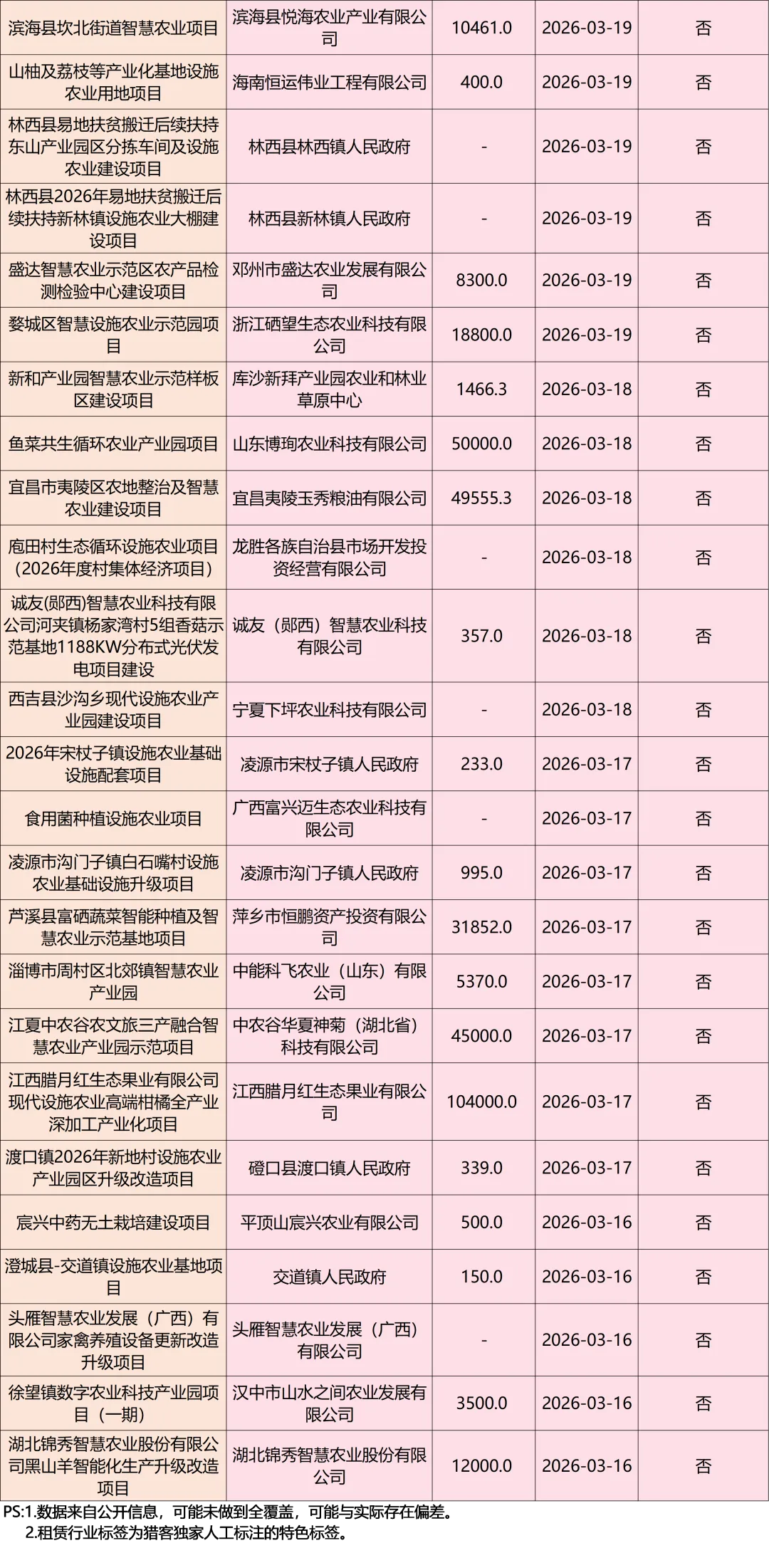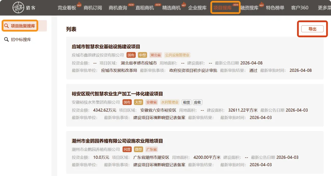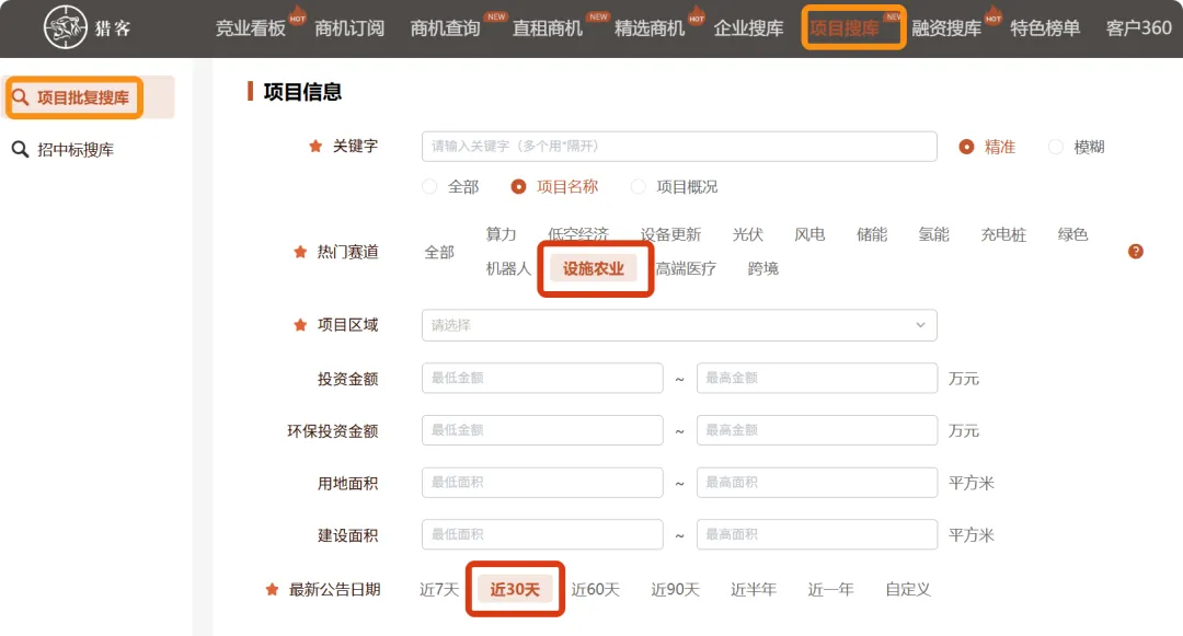 为助力大家精准把握智慧农业市场前沿,猎客汇总整理了近30天智慧农业项目清单,以供参考~以上数据来自猎客项目搜库-项目批复搜库功能,只需在热门赛道中选择设施农业,然后在最新公告日期中点击近30天,点击查询后,就能轻松获取我们需要的项目清单列表。