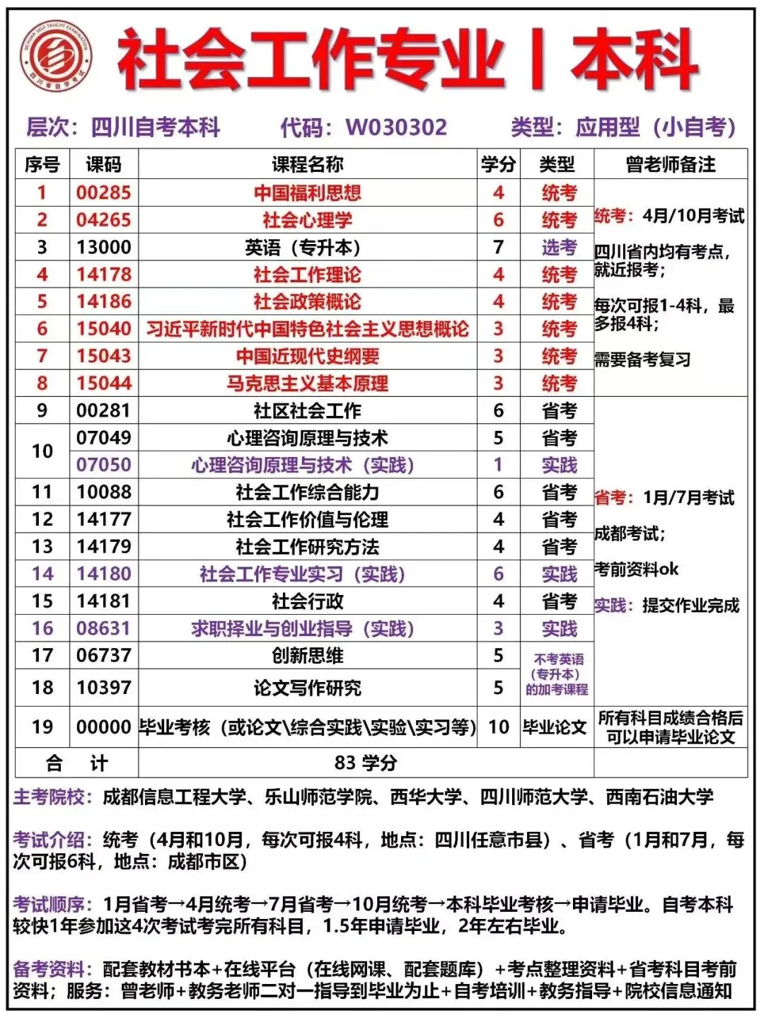 四川农业大学小自考社会工作专业是法学学士,属于应用型自考(小自考),依托四川农业大学 双一流 、211特色,本专业具备人文社科与农林交叉优势,主打乡村社工、社区治理、老年、儿童福利、社会救助,毕业后学历学信网可查、可用于考公、考编、考社工证、考研究生。
