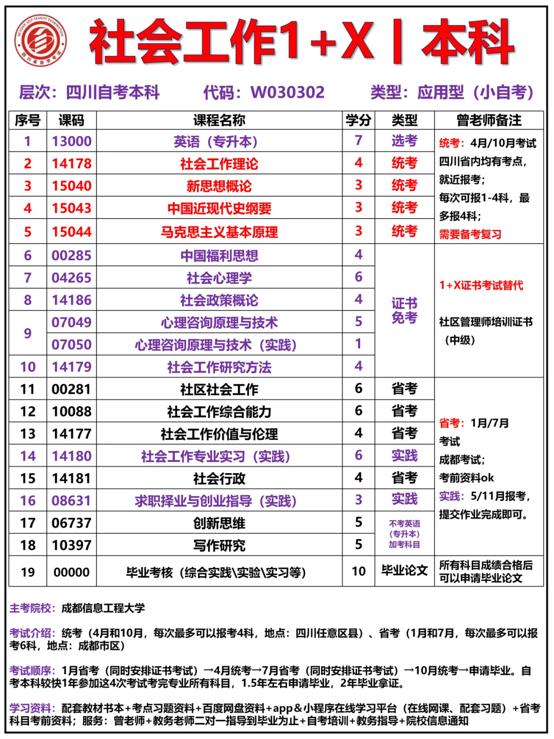 想进一步降低考试难度的同学,可以考虑:成都信息工程大学 社会工作专业1+x 自考专升本,统考仅4科。