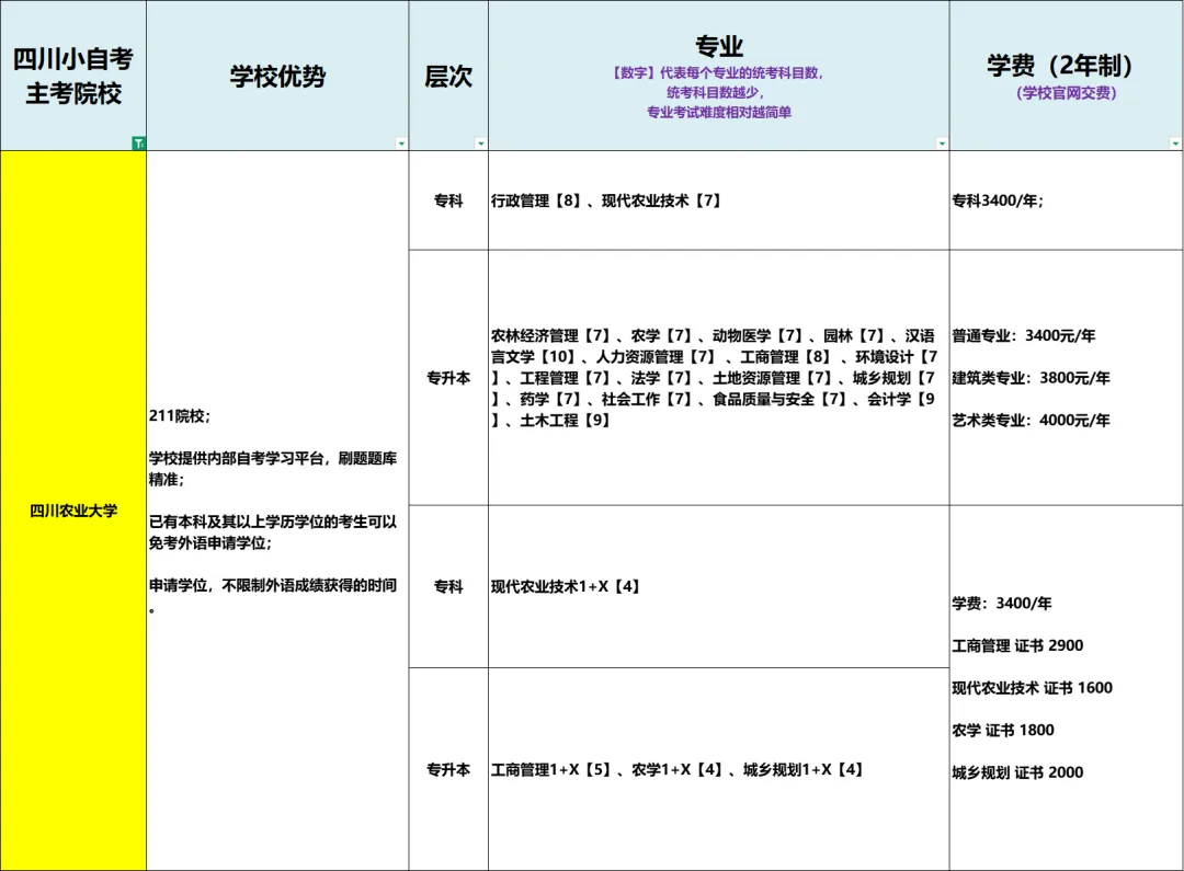 四川农业大学小自考学费(2年制)