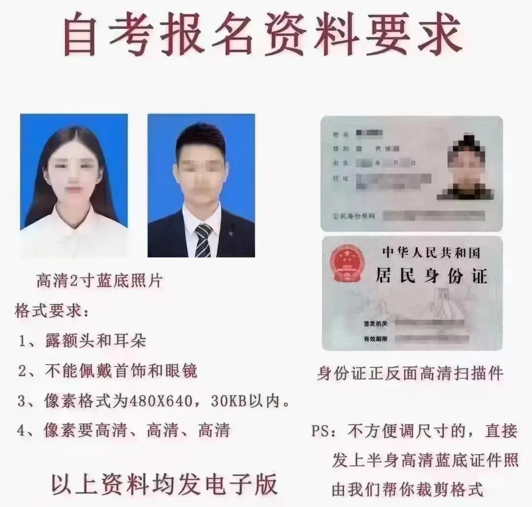 自考报名注册需要考生提供:蓝底证件照+身份证正反面照片