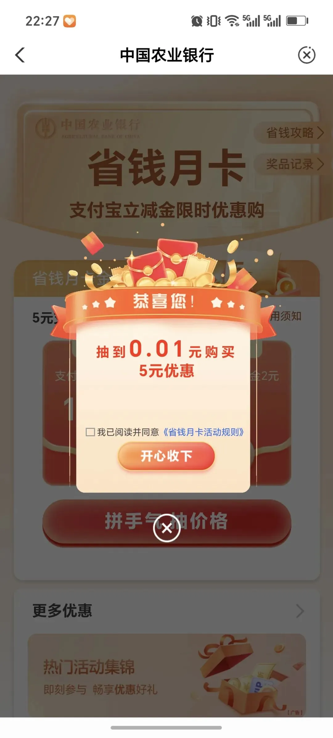 农行支付宝省钱卡,最低0.01元撸5元支付立减金!