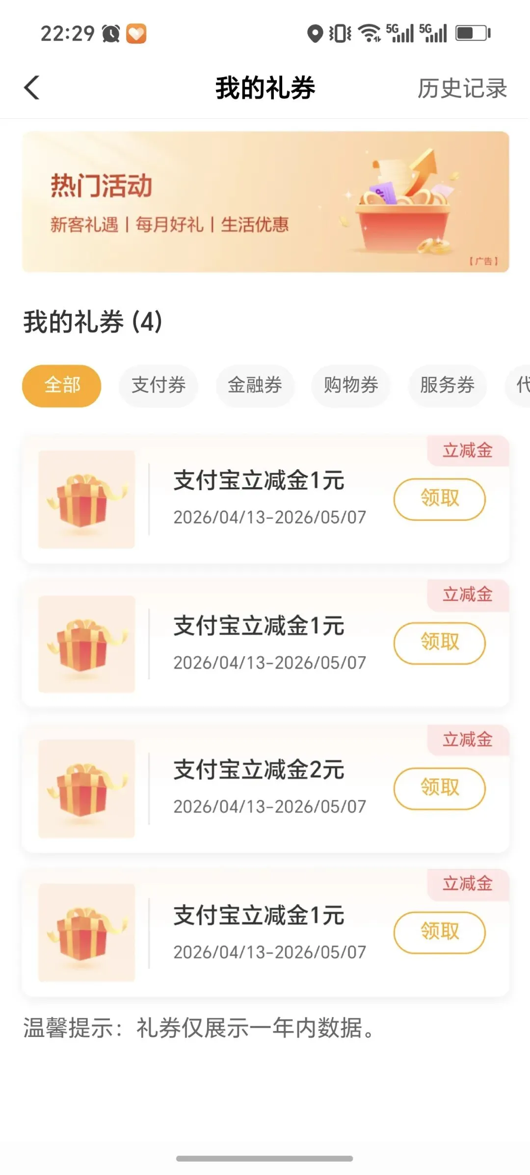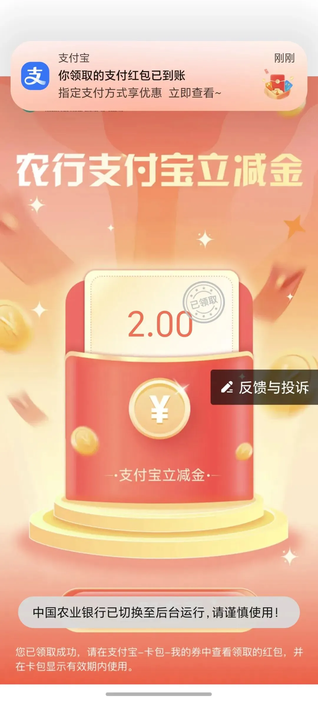 立减金 领取后在支付宝 App--卡包