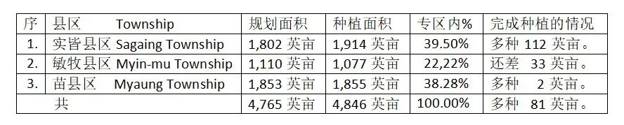 3个县区中,以实皆县区完成的种植面积为最多,不仅完成规划种植面积,还多种植112英亩。其次为苗县区,与规划面积相比多种植2英亩。这两个县区规划种植的冬洋葱面积各占全专区规划种植面积的近五分之二的比例,而敏牧县区规划种植的冬洋葱面积不到全专区规划面积的¼ 比例。