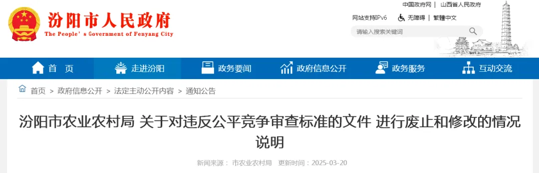 根据吕梁市市场监督管理局《关于整改公平竞争审查第三方评估发现问题的函》(吕市监函(2025)23号)批示要求,对违反公平竞争审查标准的文件:汾阳市人民政府《关于印发汾阳市2024年“汾享杏福”现代农业科技示范园暨特色产业实施方案的通知》(汾政办发(2024)10号)文件中第四部分“发展目标”中的的第二条内容“酿酒高粱产业的扶持政策:对农户以最低保护价收购,具体价格结合玉米亩产值与山西杏花村汾酒集团有限责任公司商定”进行删除。