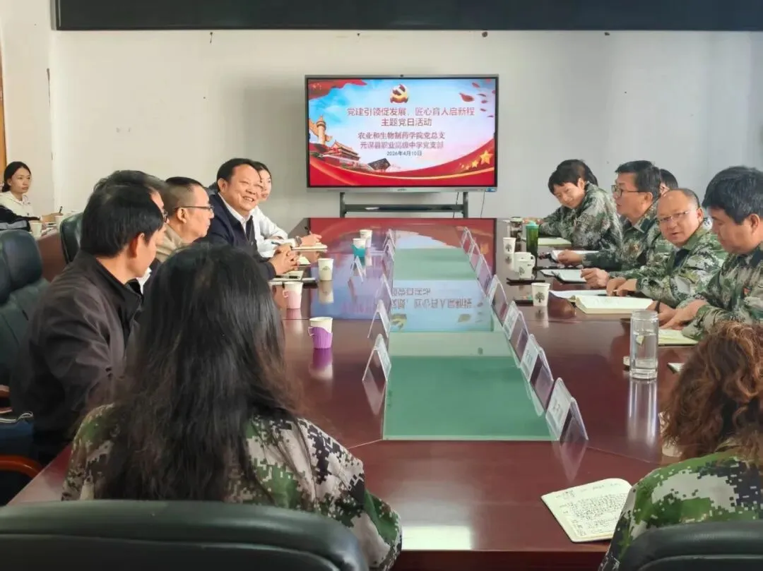 为深入学习贯彻习近平新时代中国特色社会主义思想,牢牢把握立德树人根本任务,深化校校党建联建共建,推动职业教育资源互通共享、专业协同共进,4月10日,农业和生物制药学院党总支、纪检审计党支部与元谋县职业高级中学党支部联合开展“党建引领促发展,匠心育人启新程”主题党日活动。活动伊始,元谋县职业高级中学党支部一行受邀参加农业和生物制药学院国防教育总结表扬大会,全体党员共同接受深刻的爱国主义教育与党性淬炼,厚植爱国情怀、强化使命担当。随后,双方召开党建与业务融合交流座谈会,聚焦党建引领专业建设、职业教育赋能地方产业发展、实训基地共建共享、师资队伍联合培养等核心议题深入研讨、充分交流,凝聚资源共享、优势互补、协同发展的共识。活动期间,全体党员面向鲜红党旗庄严宣誓,重温入党誓词,坚守初心使命。大家共同参观学院工匠精神数字体验中心与校史馆,沉浸式感悟学院深厚办学底蕴与鲜明育人理念。