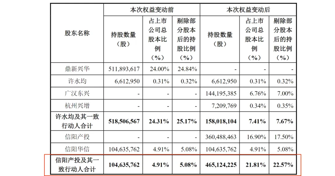 这次控制权变更没有走市场上常见的协议转让路径,也没有通过定增或者要约收购的方式推进,而是直接对控股股东鼎新兴华进行解散清算,名下股份按照出资比例分配,最终信阳市财政局成为了公司的实控人。
