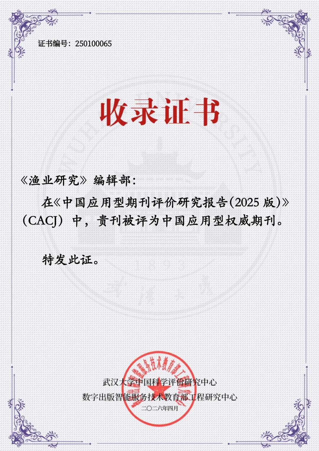 近日,《中国应用型期刊评价研究报告(2025版)》正式发布。由福建省水产学会和福建省水产研究所共同主办的学术期刊《渔业研究》获评“中国应用型权威期刊”。