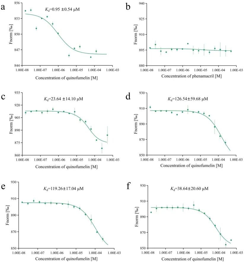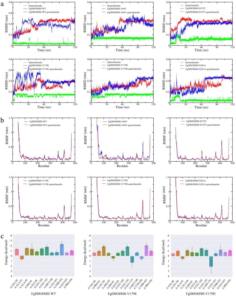 近日,南京农业大学植物保护学院杀菌剂生物学团队段亚冰教授与周明国教授课题组在中科院一区TOP期刊《Molecular Plant Pathology》上发表了题为“Molecular Mechanism Underlying Resistance Variation to the Novel Agrochemical Quinofumelin in Fusarium graminearum”的研究论文。该研究系统阐明了禾谷镰孢菌对新型喹啉类杀菌剂quinofumelin产生抗药性的分子基础,为该药剂的科学应用及新型靶向杀菌剂创制提供了重要理论依据。Quinofumelin作为一种新型广谱杀菌剂,具有独特的作用机制,对多种重要作物病害均有显著防效。此前,段亚冰教授与周明国教授团队已在《eLife》发表重磅研究,首次发现quinofumelin的作用靶标为嘧啶从头合成途径的关键酶-二氢乳清酸脱氢酶(DHODH),这一发现拓宽了杀菌剂的作用靶标类型。在此基础上,团队进一步围绕禾谷镰孢菌对quinofumelin的抗药性分子机制展开深入研究。研究利用AlphaFold3构建了FgDHODHII的三维结构,并结合分子对接与同源重组技术,构建了5个FgDHODHII定点突变体,明确了155、179、281位氨基酸是调控禾谷镰孢菌对quinofumelin产生抗性的关键位点。其中,FgDHODHII-D155T突变体表现为低水平抗性,FgDHODHII-N281A突变体为中等水平抗性,FgDHODHII-V179E和FgDHODHII-V179D突变体则呈现高水平抗性。图1 PH-1及FgDHODHII突变体对quinofumelin的敏感性测定同时,研究发现quinofumelin抗性突变体存在明显的适合度代价,FgDHODHII-D155T、FgDHODHII-V179E、FgDHODHII-V179D和FgDHODHII-N281A抗性突变体的产孢能力和致病力均显著下降,这为田间延缓抗药性菌株的传播提供了天然优势。交互抗性结果显示,quinofumelin仅与同为DHODH抑制剂的ipflufenoquin存在交互抗性,而与其他常用杀菌剂(氰烯菌酯、多菌灵、戊唑醇、丙硫菌唑、氟唑菌酰羟胺、氟吡菌酰胺、苯并烯氟菌唑、吡唑醚菌酯和嘧菌酯)均无交互抗性,为田间杀菌剂的科学轮换使用提供了理论依据。图2 PH-1及FgDHODHII突变体致病力测定图3 Quinofumelin与其他杀菌剂的交互抗性分析此外,分子对接、分子动力学模拟及微量热泳动等技术手段进一步证实,D155T、V179E、V179D和N281A突变改变了FgDHODHII与quinofumelin的结合模式,导致二者结合亲和力显著下降,这是禾谷镰孢菌对quinofumelin产生抗药性的核心分子机制。图4 quinofumelin与FgDHODHII蛋白的分子对接分析图5 FgDHODHII-quinofumelin复合物的分子动力学模拟图6 quinofumelin与FgDHODHII的微量热泳动分析该研究从分子水平系统揭示了quinofumelin抗性形成的关键机制,不仅深化了对DHODH靶标功能的认识,也为新型杀菌剂quinofumelin的合理使用及抗药性管理策略的制定提供了重要科学依据。未来,基于DHODH靶标的精准农药设计与抗性风险评估将成为该领域的重要研究方向。南京农业大学在读博士生殷消茹为该论文的第一作者,段亚冰教授为通讯作者。该研究得到了国家重点研发计划(2022YFD1400100),农业与林业生物安全国家重点实验室联合研究计划(SKLJRP2510)和国家自然科学基金项目(32072448)的资助。