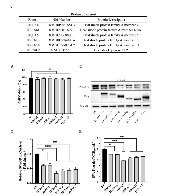 近年来,SVA在巴西、中国、美国等主要养猪国家快速传播,导致新生仔猪急性死亡、母猪繁殖障碍及猪群水疱性病变,给全球猪业造成重大经济损失。目前,尚无针对SVA的商品化疫苗,防控主要依赖严格的生物安全措施。病毒复制的分子机制仍不完全清楚,宿主细胞如何天然限制SVA复制,成为研究热点。热休克蛋白(HSPs)家族作为细胞内重要的分子伴侣,广泛参与蛋白质折叠、运输和降解,在多种病毒感染中发挥调控作用。安徽农业大学研究团队以此为切入点,系统筛选HSPs家族成员对SVA增殖的影响。