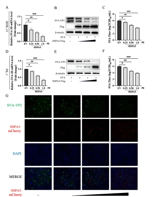 研究团队选取了猪源HSP家族多个代表性成员(HSPA4、HSPA4L、HSPA5、HSPA13、HSPA14、HSP70.2等),构建表达质粒并转染BHK-21细胞。细胞活力检测显示,各转染组细胞状态一致。随后以0.01 MOI SVA感染细胞,16小时后收集样本。通过Western blot、RT-qPCR和TCID₅₀测定病毒复制水平,结果显示:仅HSPA5过表达组显著降低SVA VP2蛋白表达、病毒RNA拷贝数及病毒滴度,而其他HSP成员影响不明显或无显著作用。这一抑制效应在PK-1猪肾细胞中同样成立,且呈明显的剂量依赖性:随着HSPA5表达质粒转染量增加,病毒复制指标逐步下降。间接免疫荧光(IFA)也观察到VP2荧光强度随HSPA5表达增强而减弱。