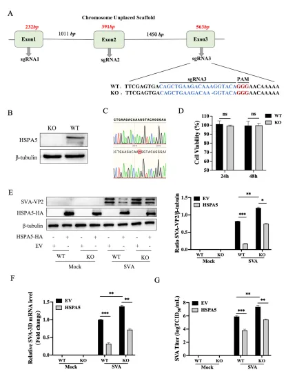 为进一步验证HSPA5的必要性,团队利用CRISPR-Cas9技术构建了HSPA5基因敲除的BHK-21稳定细胞系(BHK-HSPA5-KO)。Western blot和Sanger测序确认敲除成功,细胞活力检测显示敲除不影响细胞增殖。