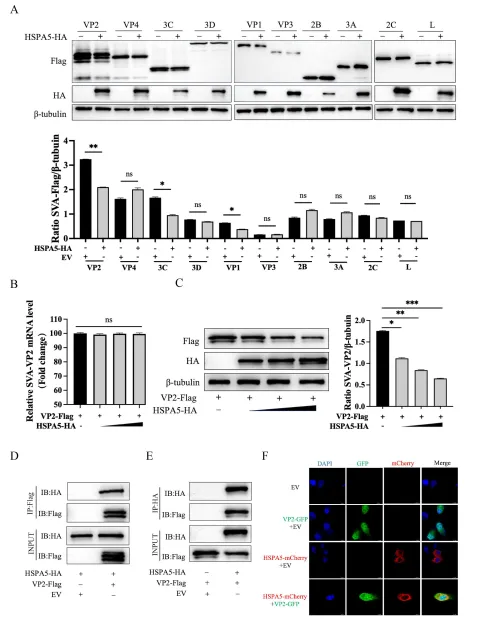 为解析HSPA5的分子作用靶标,团队将HSPA5-HA质粒与SVA各编码蛋白(VP1、VP2、VP3、VP4、L、2B、2C、3A、3C、3D)的Flag标签质粒共转染HEK-293T细胞。Western blot筛查显示,HSPA5可降解VP1、VP2和3C蛋白,其中对VP2的降解作用最为显著,且呈剂量依赖性,同时不影响VP2 mRNA转录水平。免疫共沉淀(Co-IP)实验证实HSPA5与VP2存在物理相互作用;激光共聚焦显微镜观察到两者在细胞质中共定位。SVA实际感染条件下,过表达HSPA5仍能与VP2结合并共定位,进一步验证了这一相互作用的生理相关性。