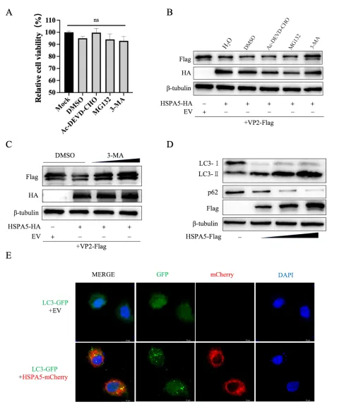 细胞内蛋白降解主要通过凋亡、自噬-溶酶体和泛素-蛋白酶体三条途径。研究团队分别使用凋亡抑制剂Ac-DEVD-CHO、自噬抑制剂3-甲基腺嘌呤(3-MA)和蛋白酶体抑制剂MG132处理共转染细胞。细胞活力检测确认各抑制剂无明显毒性。结果显示,仅3-MA能剂量依赖性地恢复VP2蛋白水平,提示HSPA5通过自噬-溶酶体途径降解VP2。进一步实验发现,HSPA5过表达显著促进LC3-I向LC3-II转化、降低自噬底物p62水平,并增加LC3-GFP斑点形成,证实HSPA5可诱导自噬发生。