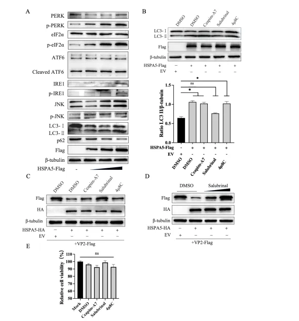 HSPA5作为内质网分子伴侣,是未折叠蛋白反应(UPR)的核心调控因子。UPR包括IRE1、PERK和ATF6三条分支。Western blot分析显示,HSPA5过表达剂量依赖性地激活PERK磷酸化及其下游eIF2α磷酸化,同时IRE1、JNK和ATF6分支也有一定激活,但PERK通路最为显著。使用PERK特异性抑制剂Salubrinal、IRE1抑制剂4μ8C和ATF6抑制剂Ceapim-A7处理后,仅Salubrinal能有效阻断HSPA5诱导的LC3-II增加,并恢复VP2蛋白水平,且呈剂量依赖性。细胞活力检测排除抑制剂毒性影响。这些结果明确,HSPA5通过激活UPR的PERK-eIF2α通路诱导自噬,进而介导VP2降解。