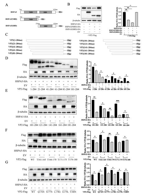 HSPA5包含N端核苷酸结合域(NBD,aa 1-333)和C端底物结合域(SBD,aa 334-652)。构建截短体实验显示,仅NBD片段可有效降解VP2,SBD则无此功能,表明NBD是执行降解功能的关键结构域。反向针对VP2,研究团队构建了一系列20个氨基酸步进的截短体及丙氨酸扫描突变体,最终将关键位点定位于VP2第176-180氨基酸区域,进一步通过点突变鉴定出Thr180为HSPA5介导降解的关键残基。T180N突变完全恢复VP2蛋白水平,但不影响与HSPA5的结合,说明该位点特异性参与降解过程而非结合。
